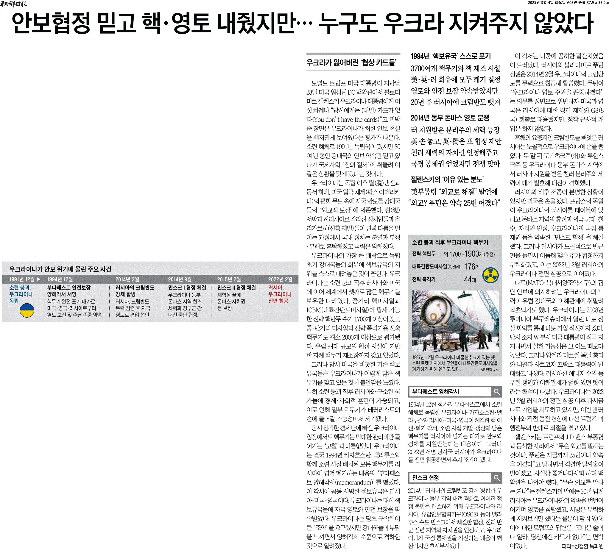 ① 도널드 트럼프 미국 대통령이 지난달 28일 미국 워싱턴 DC 백악관에서 볼로디미르 젤렌스키 우크라이나 대통령에게 여섯 차례나 “당신에게는 (내밀) 카드가 없다(You don’t have the cards)”고 면박 준 장면은 우크라이나가 처한 안보 현실을 뼈저리게 보여줬다는 평가가 나온다. 소련 해체로 1991년 독립국이 됐지만 30여 년 동안 강대국의 안보 약속만 믿고 있다가 국제사회 ‘힘의 질서’에 휘둘려 이 같은 상황을 맞게 됐다는 것이다.