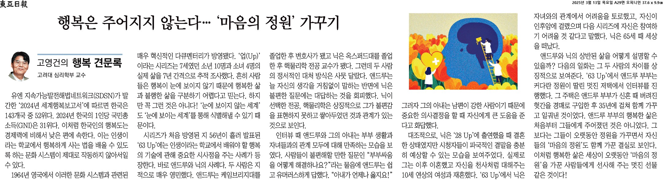 ② 1964년 영국에서 이러한 문화 시스템과 관련된 매우 혁신적인 다큐멘터리가 방영됐다. ‘업(Up)’이라는 시리즈는 7세였던 소년 10명과 소녀 4명의 실제 삶을 7년 간격으로 추적 조사했다. 흔히 사람들은 행복이 눈에 보이지 않기 때문에 행복한 삶과 불행한 삶을 구분하기 어렵다고 믿는다.