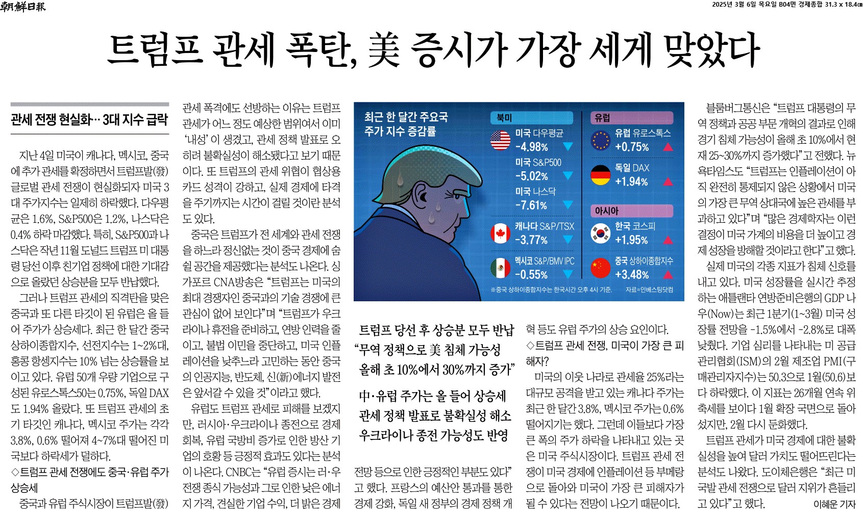 ① 지난 4일 미국이 캐나다, 멕시코, 중국에 추가 관세를 확정하면서 트럼프발(發) 글로벌 관세 전쟁이 현실화되자 미국 3대 주가지수는 일제히 하락했다. 다우평균은 1.6%, S&P500은 1.2%, 나스닥은 0.4% 하락 마감했다. 특히, S&P500과 나스닥은 작년 11월 도널드 트럼프 미 대통령 당선 이후 친기업 정책에 대한 기대감으로 올랐던 상승분을 모두 반납했다.