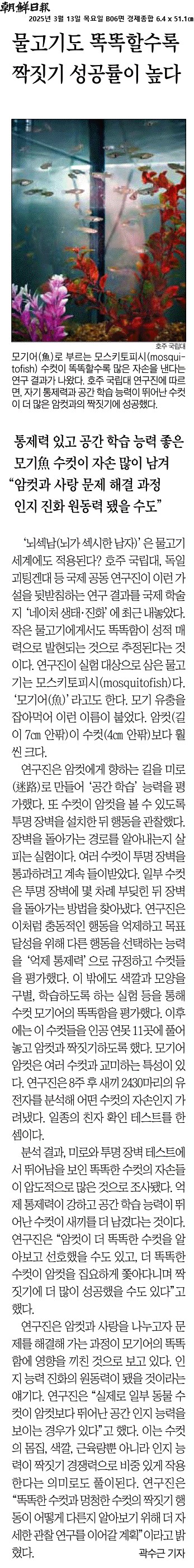 ④ 연구진은 “암컷이 더 똑똑한 수컷을 알아보고 선호했을 수도 있고, 더 똑똑한 수컷이 암컷을 집요하게 쫓아다니며 짝짓기에 더 많이 성공했을 수도 있다”고 했다.