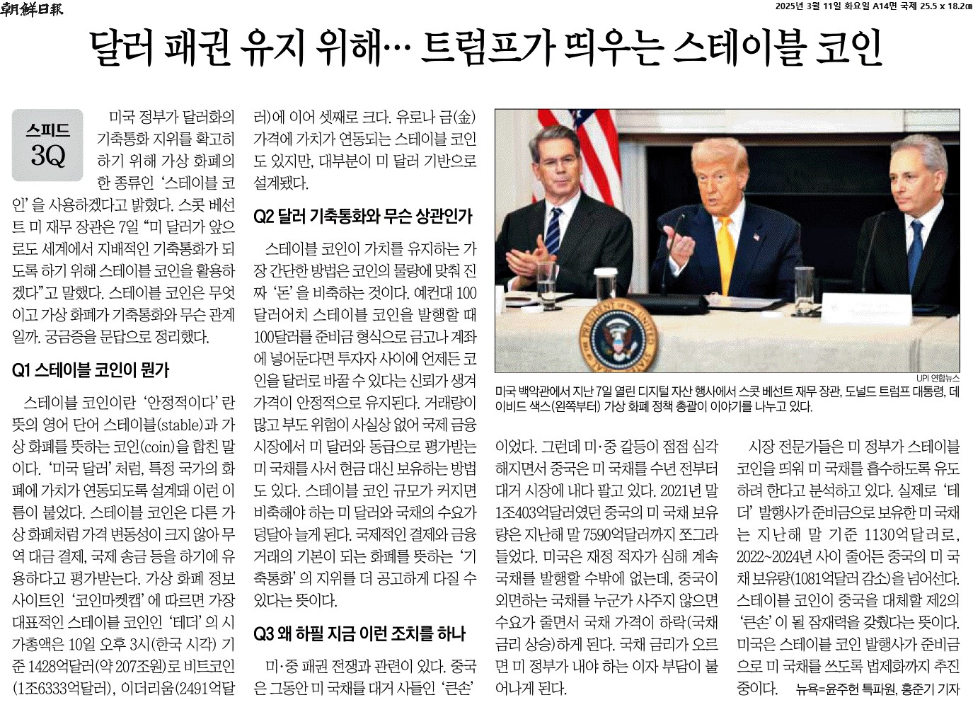 ⑤ 시장 전문가들은 미 정부가 스테이블 코인을 띄워 미 국채를 흡수하도록 유도하려 한다고 분석하고 있다. 실제로 ‘테더’ 발행사가 준비금으로 보유한 미 국채는 지난해 말 기준 1130억달러로, 2022~2024년 사이 줄어든 중국의 미 국채 보유량(1081억달러 감소)을 넘어선다. 스테이블 코인이 중국을 대체할 제2의 ‘큰손’이 될 잠재력을 갖췄다는 뜻이다.