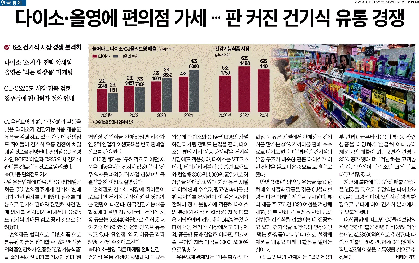 ④ 반면 1999년 의약품 유통을 놓고 한 차례 약사들과 갈등을 겪은 CJ올리브영은 다른 마케팅 전략을 구사한다. 뷰티 제품 주 고객인 1020 여성을 겨냥해 체형, 피부 관리, 스트레스 관리 등과 관련한 건기식을 선보이는 데 집중하고 있다. 건기식을 화장품의 연장선인 ‘먹는 화장품’(이너뷰티)으로 설정해 제품을 내놓고 마케팅 활동을 벌이는 것이다.