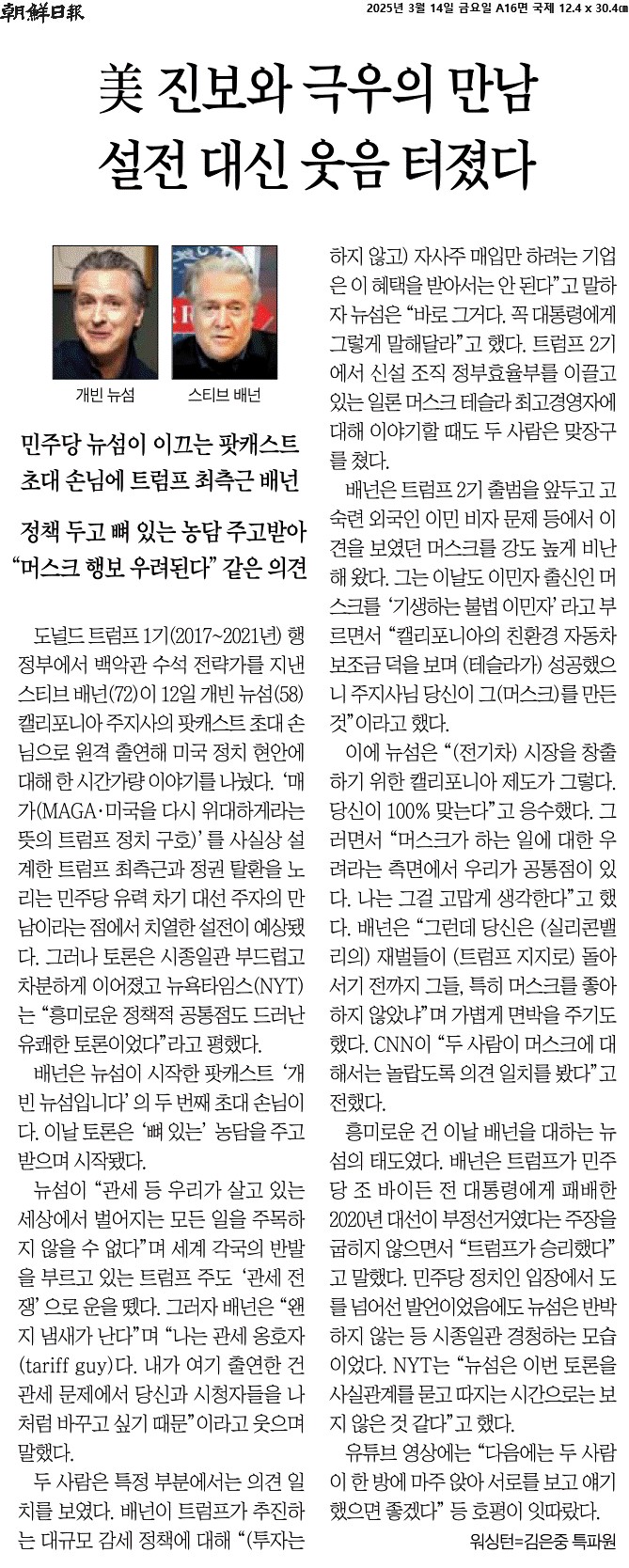 ③ 배넌이 트럼프가 추진하는 대규모 감세 정책에 대해 “(투자는 하지 않고) 자사주 매입만 하려는 기업은 이 혜택을 받아서는 안 된다”고 말하자 뉴섬은 “바로 그거다. 꼭 대통령에게 그렇게 말해달라”고 했다.