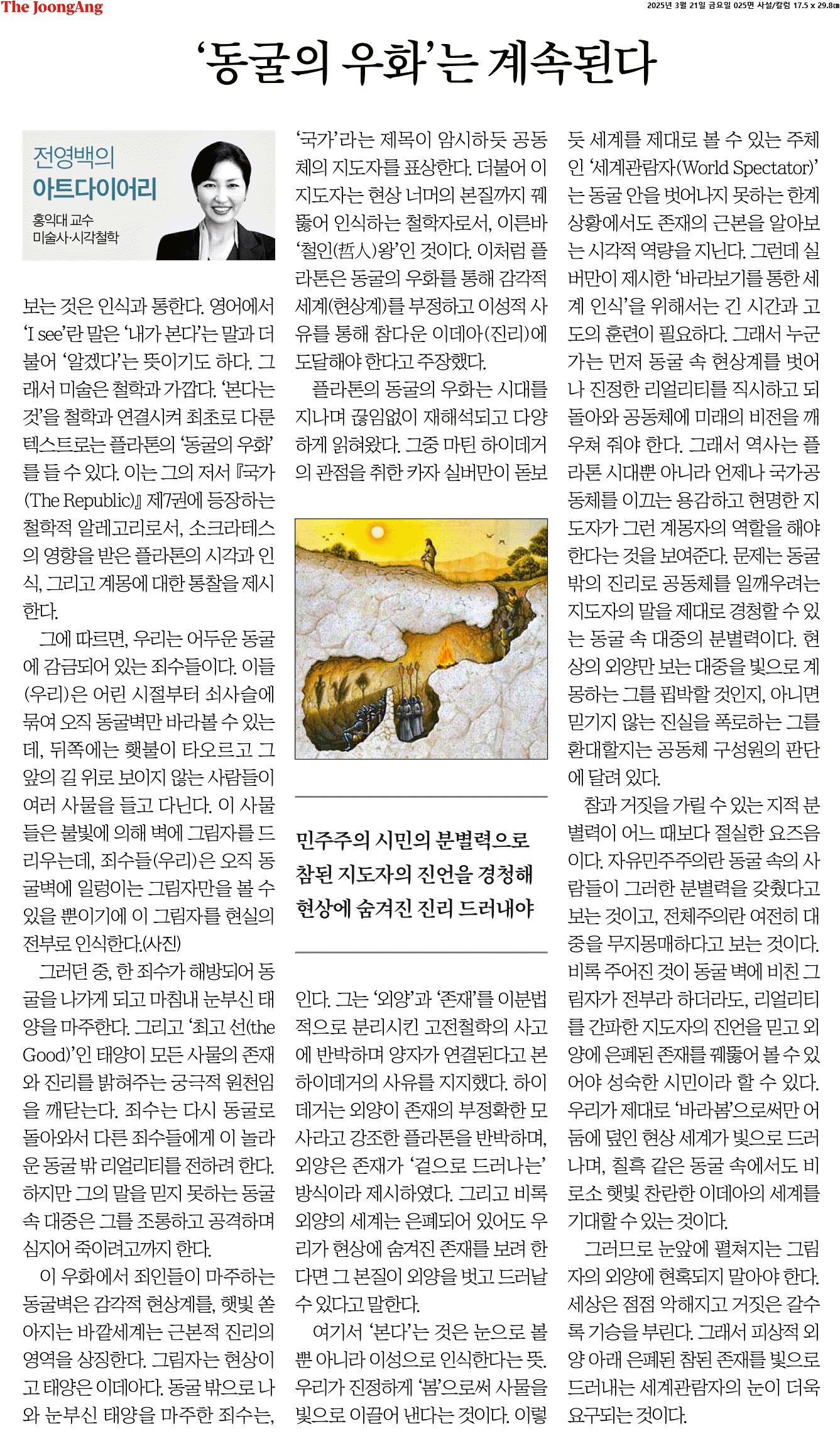 ① 보는 것은 인식과 통한다. 영어에서 ‘I see’란 말은 ‘내가 본다’는 말과 더불어 ‘알겠다’는 뜻이기도 하다. 그래서 미술은 철학과 가깝다. ‘본다는 것’을 철학과 연결시켜 최초로 다룬 텍스트로는 플라톤의 ‘동굴의 우화’를 들 수 있다. 이는 그의 저서 『국가(The Republic)』 제7권에 등장하는 철학적 알레고리로서, 소크라테스의 영향을 받은 플라톤의 시각과 인식, 그리고 계몽에 대한 통찰을 제시한다.