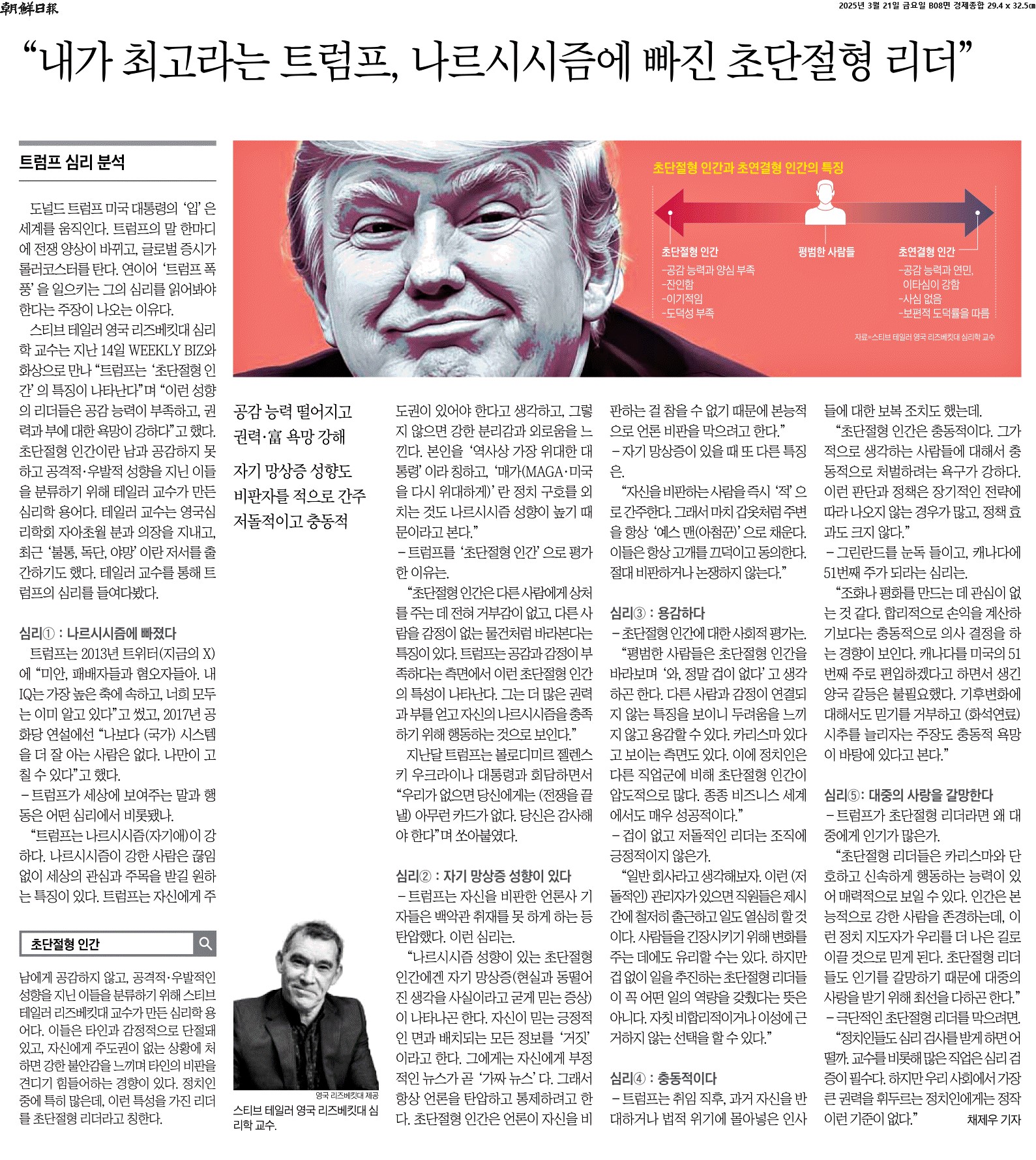 ② “트럼프는 나르시시즘(자기애)이 강하다. 나르시시즘이 강한 사람은 끊임없이 세상의 관심과 주목을 받길 원하는 특징이 있다. 트럼프는 자신에게 주도권이 있어야 한다고 생각하고, 그렇지 않으면 강한 분리감과 외로움을 느낀다. 본인을 ‘역사상 가장 위대한 대통령’이라 칭하고, ‘매가(MAGA·미국을 다시 위대하게)’란 정치 구호를 외치는 것도 나르시시즘 성향이 높기 때문이라고 본다.”