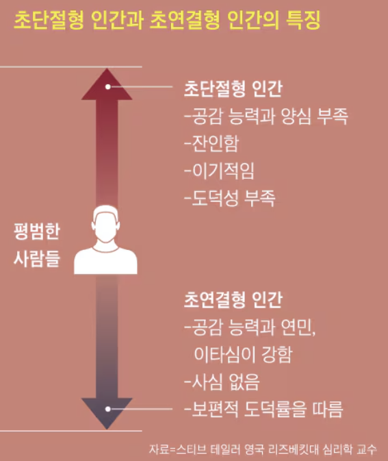 ④ “평범한 사람들은 초단절형 인간을 바라보며 ‘와, 정말 겁이 없다’고 생각하곤 한다. 다른 사람과 감정이 연결되지 않는 특징을 보이니 두려움을 느끼지 않고 용감할 수 있다. 카리스마 있다고 보이는 측면도 있다. 이에 정치인은 다른 직업군에 비해 초단절형 인간이 압도적으로 많다. 종종 비즈니스 세계에서도 매우 성공적이다.”
