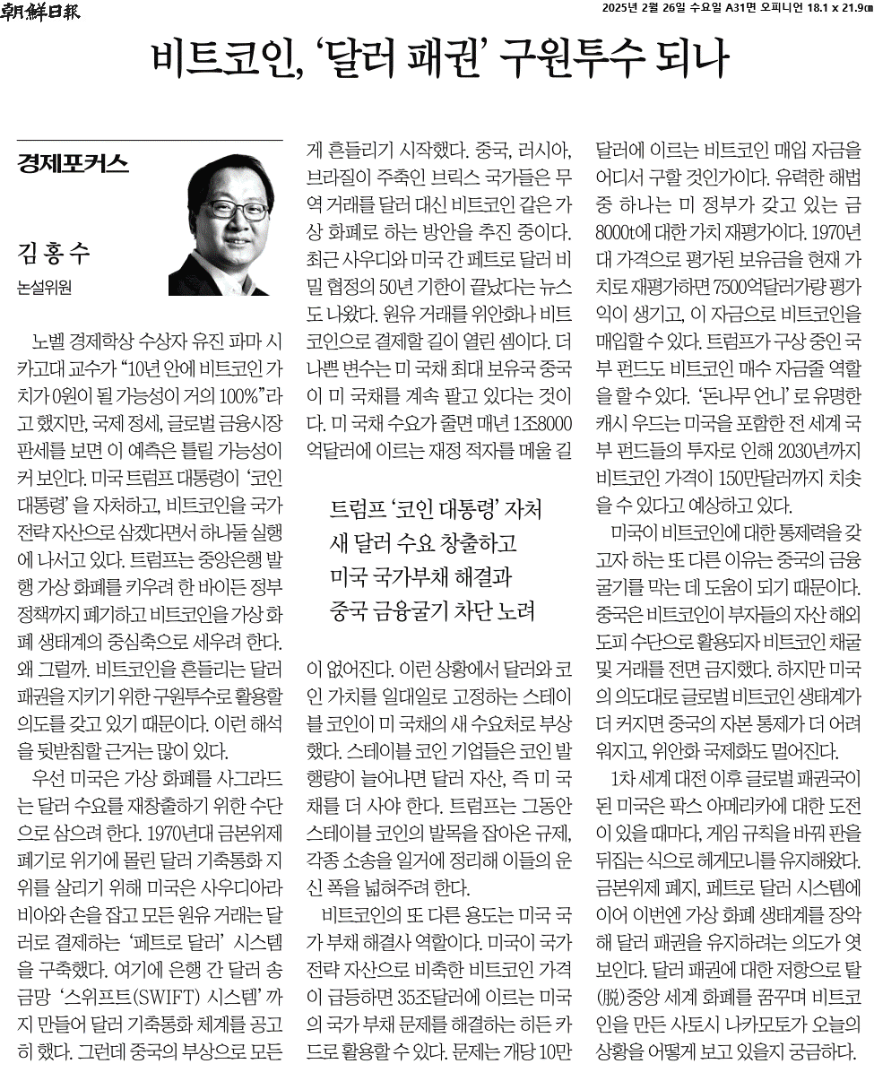 ① 노벨 경제학상 수상자 유진 파마 시카고대 교수가 “10년 안에 비트코인 가치가 0원이 될 가능성이 거의 100%”라고 했지만, 국제 정세, 글로벌 금융시장 판세를 보면 이 예측은 틀릴 가능성이 커 보인다. 미국 트럼프 대통령이 ‘코인 대통령’을 자처하고, 비트코인을 국가 전략 자산으로 삼겠다면서 하나둘 실행에 나서고 있다.