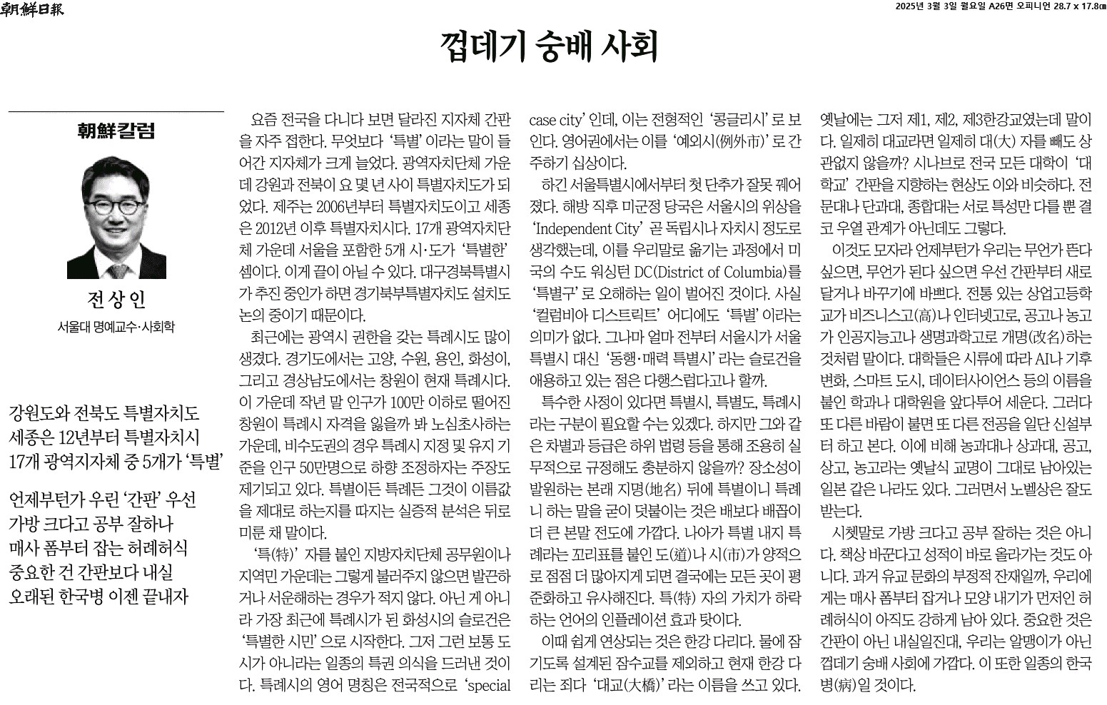 ④ 나아가 특별 내지 특례라는 꼬리표를 붙인 도(道)나 시(市)가 양적으로 점점 더 많아지게 되면 결국에는 모든 곳이 평준화하고 유사해진다. 특(特) 자의 가치가 하락하는 언어의 인플레이션 효과 탓이다.
