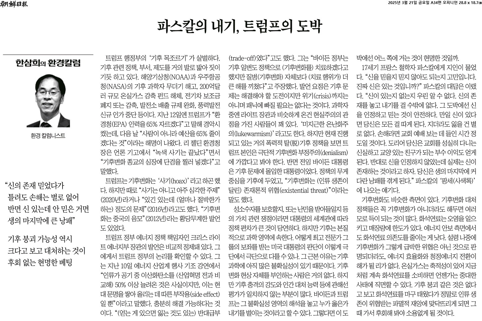 ① 트럼프 행정부의 ‘기후 목조르기’가 살벌하다. 리 젤딘 환경청장은 언론 기고에서 “녹색 사기는 끝났다”면서 “기후변화 종교의 심장에 단검을 찔러 넣겠다”고 말했다.