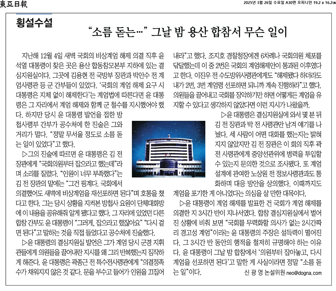⑤ 윤 대통령이 계엄 해제를 발표한 건 국회가 계엄 해제를 의결한 지 3시간 반이 지나서였다. 합참 결심지원실에서 벌어진 상황에 비춰 보면 “국회를 무력화할 의사가 없는 2시간짜리 경고성 계엄”이라는 윤 대통령의 주장은 설득력이 떨어진다. 그 3시간 반 동안의 행적을 철저히 규명해야 하는 이유다. 윤 대통령이 그날 밤 합참에서 ‘의원부터 잡아놓고, 다시 계엄을 선포하면 된다’고 말한 게 사실이라면 정말 “소름 돋는 일”이다.