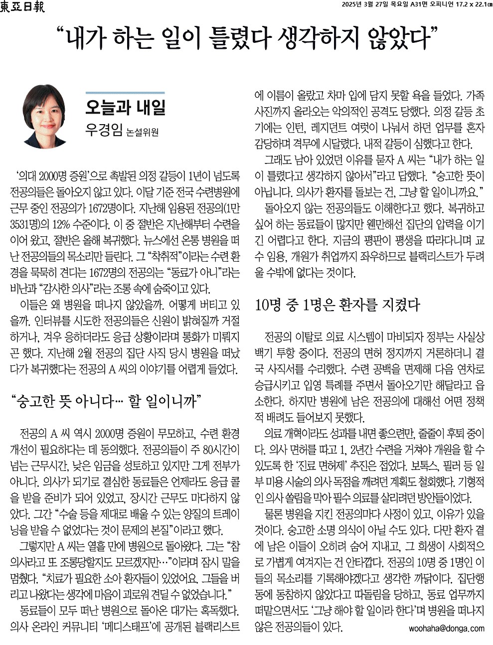 ① ‘의대 2000명 증원’으로 촉발된 의정 갈등이 1년이 넘도록 전공의들은 돌아오지 않고 있다. 이달 기준 전국 수련병원에 근무 중인 전공의가 1672명이다. 지난해 임용된 전공의(1만3531명)의 12% 수준이다. 이 중 절반은 지난해부터 수련을 이어 왔고, 절반은 올해 복귀했다. 뉴스에선 온통 병원을 떠난 전공의들의 목소리만 들린다. 그 “착취적”이라는 수련 환경을 묵묵히 견디는 1672명의 전공의는 “동료가 아니”라는 비난과 “감사한 의사”라는 조롱 속에 숨죽이고 있다.