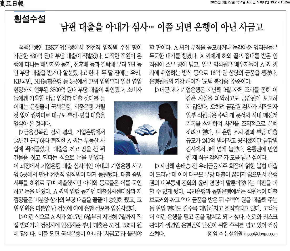 ① 국책은행인 IBK기업은행에서 전현직 임직원 수십 명이 가담한 880억 원대 부당 대출이 적발됐다. 퇴직한 직원이 은행에 다니는 배우자와 동기, 선후배 등과 결탁해 무려 7년 동안 부당 대출을 받거나 알선했다고 한다.