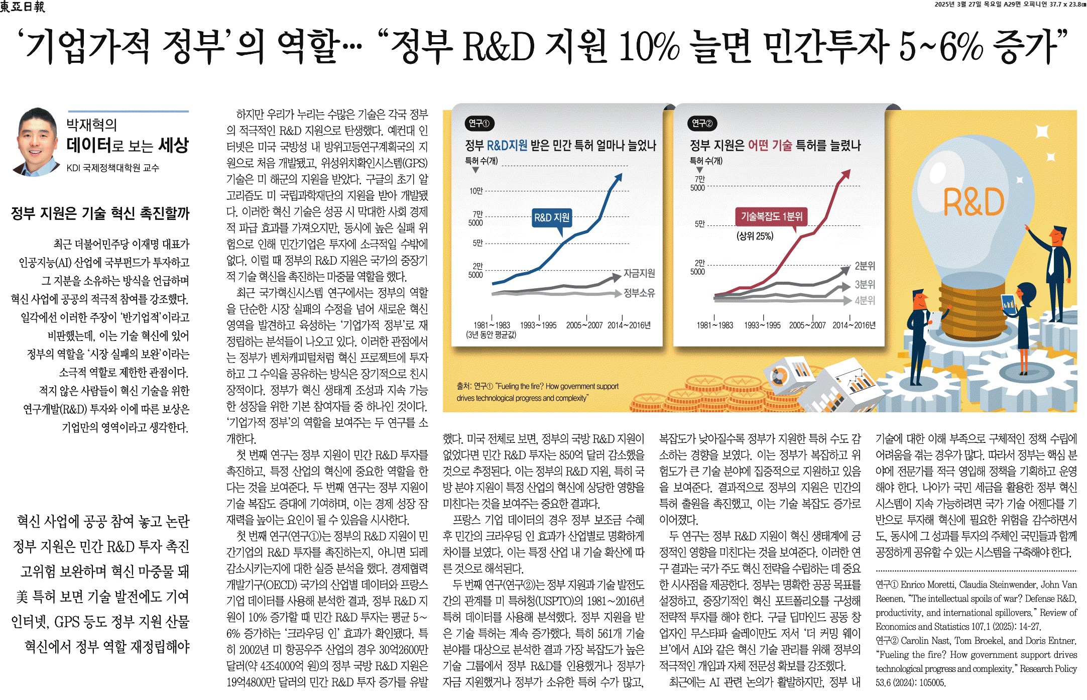 ⑤ 두 연구는 정부 R&D 지원이 혁신 생태계에 긍정적인 영향을 미친다는 것을 보여준다. 이러한 연구 결과는 국가 주도 혁신 전략을 수립하는 데 중요한 시사점을 제공한다. 정부는 명확한 공공 목표를 설정하고, 중장기적인 혁신 포트폴리오를 구성해 전략적 투자를 해야 한다. 구글 딥마인드 공동 창업자인 무스타파 술레이만도 저서 ‘더 커밍 웨이브’에서 AI와 같은 혁신 기술 관리를 위해 정부의 적극적인 개입과 자체 전문성 확보를 강조했다.