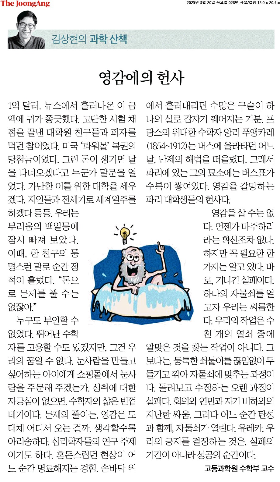 ② 성취에 대한 자긍심이 없으면, 수학자의 삶은 빈껍데기이다. 문제의 풀이는, 영감은 도대체 어디서 오는 걸까. 생각할수록 아리송하다. 심리학자들의 연구 주제이기도 하다. 혼돈스럽던 현상이 어느 순간 명료해지는 경험. 손바닥 위에서 흘러내리던 수많은 구슬이 하나의 실로 갑자기 꿰어지는 기분.