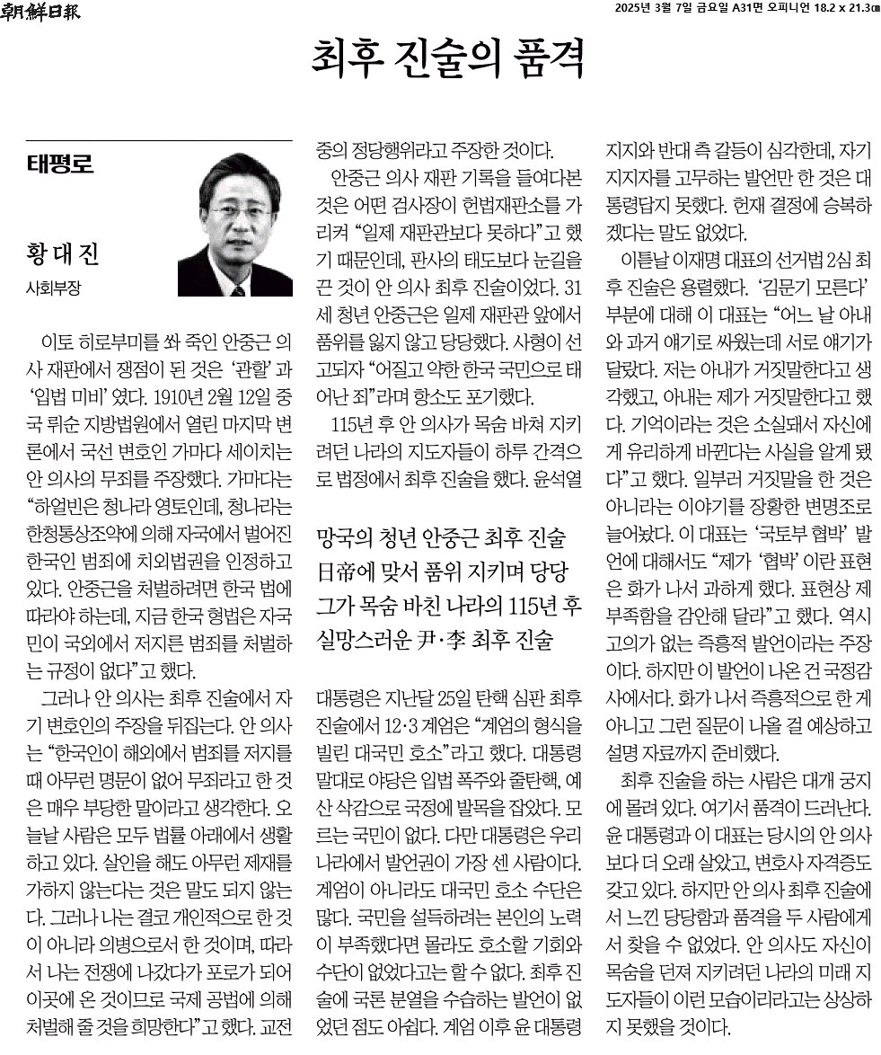 ⑤ 하지만 안 의사 최후 진술에서 느낀 당당함과 품격을 두 사람에게서 찾을 수 없었다. 안 의사도 자신이 목숨을 던져 지키려던 나라의 미래 지도자들이 이런 모습이리라고는 상상하지 못했을 것이다.