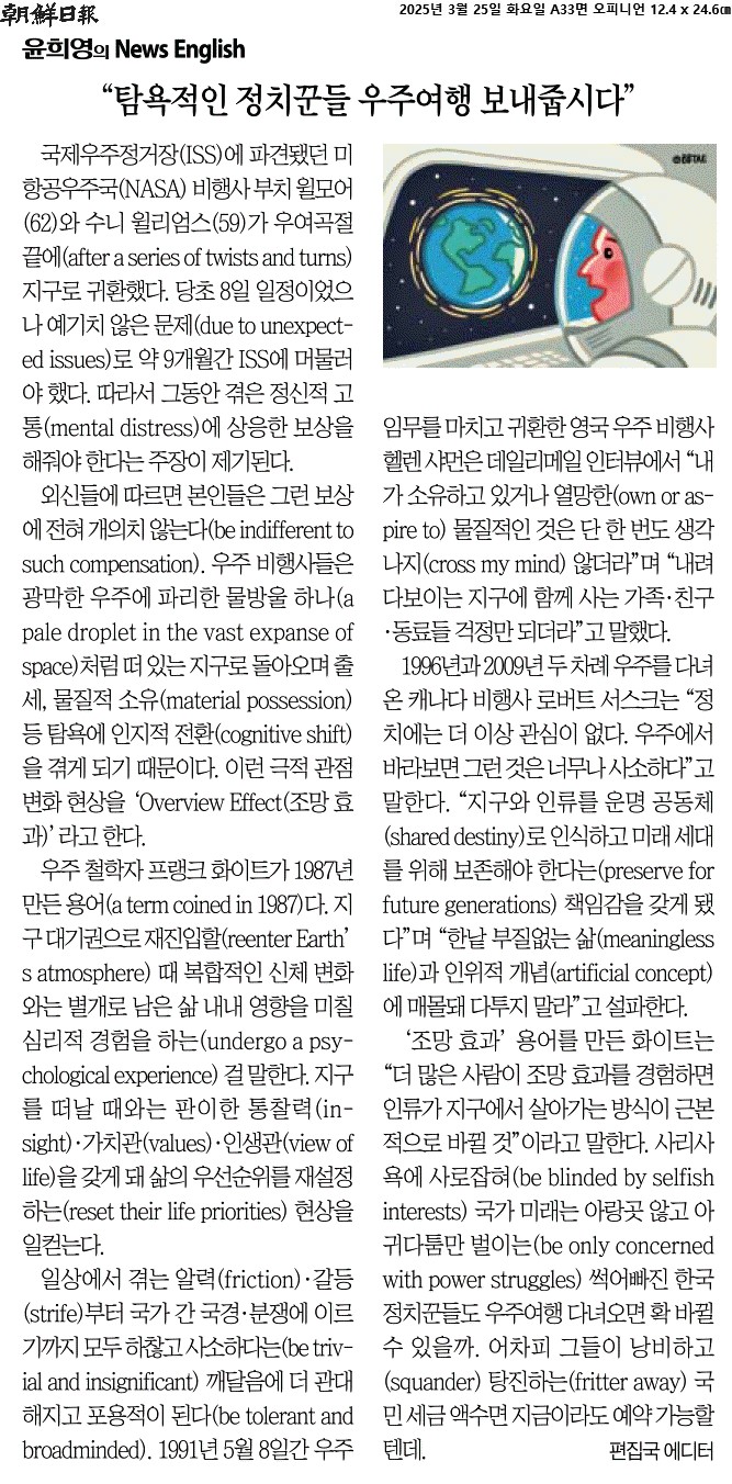 ⑤ ‘조망 효과’ 용어를 만든 화이트는 “더 많은 사람이 조망 효과를 경험하면 인류가 지구에서 살아가는 방식이 근본적으로 바뀔 것”이라고 말한다. 사리사욕에 사로잡혀(be blinded by selfish interests) 국가 미래 아랑곳 않고 아귀다툼만 벌이는(be only concerned with power struggles) 썩어빠진 한국 정치꾼들도 우주여행 다녀오면 확 바뀔 수 있을까.