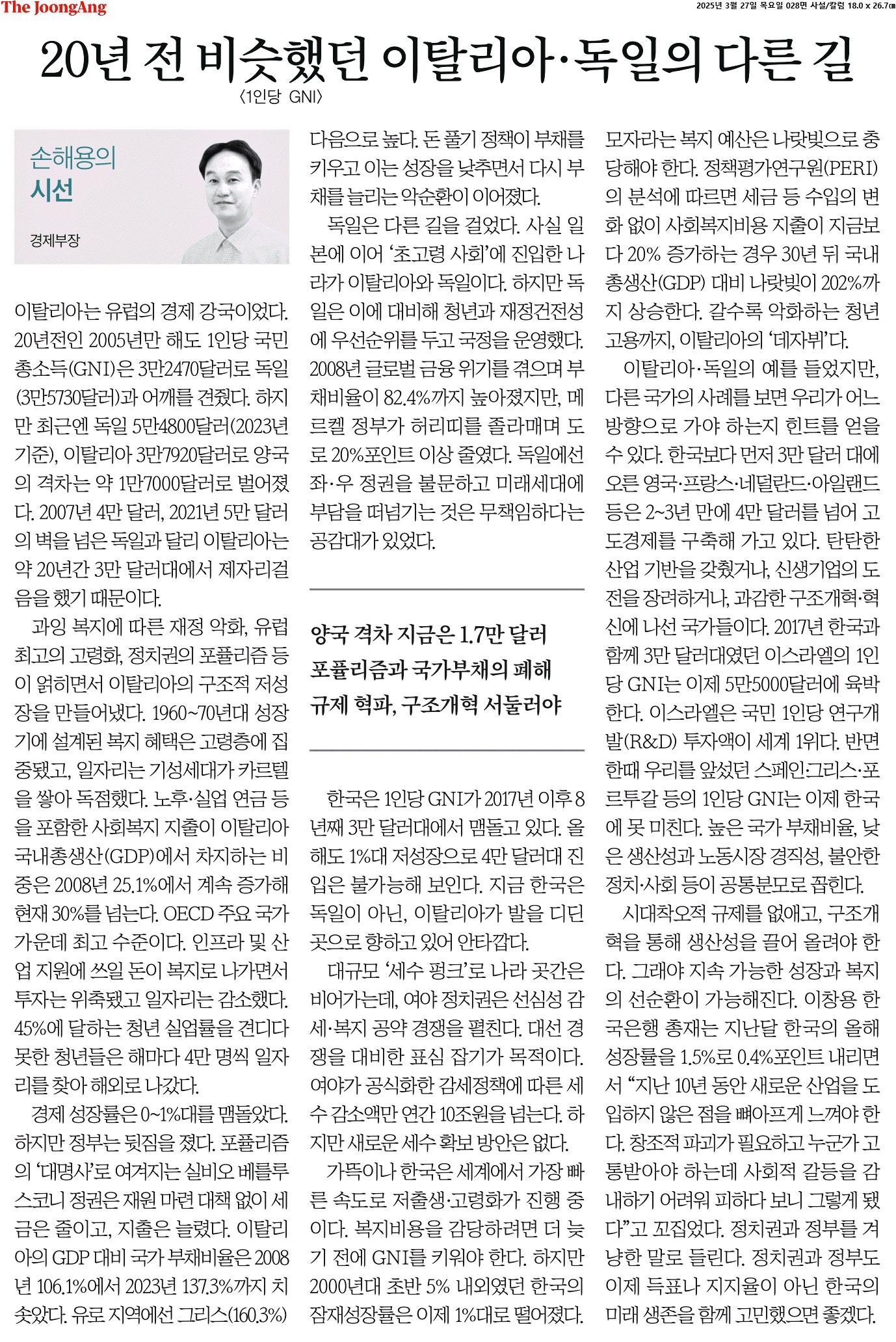 ① 이탈리아는 유럽의 경제 강국이었다. 20년전인 2005년만 해도 1인당 국민총소득(GNI)은 3만2470달러로 독일(3만5730달러)과 어깨를 견줬다. 하지만 최근엔 독일 5만4800달러(2023년 기준), 이탈리아 3만7920달러로 양국의 격차는 약 1만7000달러로 벌어졌다. 2007년 4만 달러, 2021년 5만 달러의 벽을 넘은 독일과 달리 이탈리아는 약 20년간 3만 달러대에서 제자리걸음을 했기 때문이다.