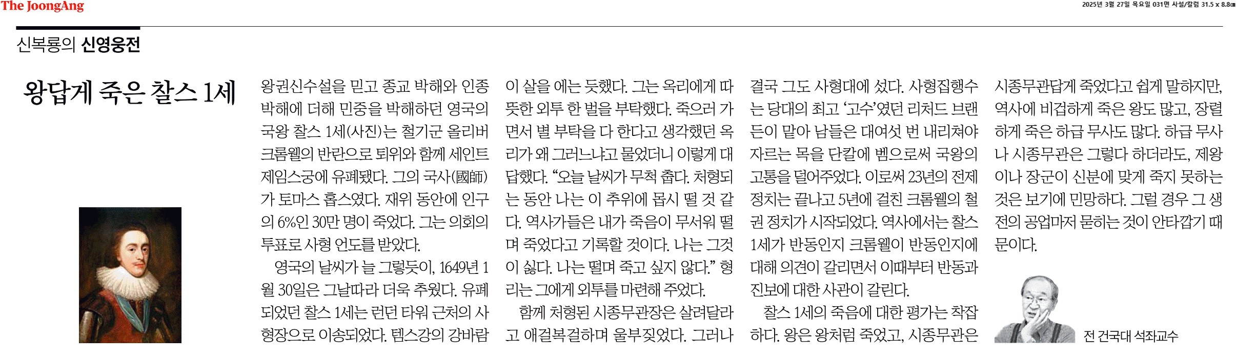 ① 왕권신수설을 믿고 종교 박해와 인종 박해에 더해 민중을 박해하던 영국의 국왕 찰스 1세(사진)는 철기군 올리버 크롬웰의 반란으로 퇴위와 함께 세인트 제임스궁에 유폐됐다. 그의 국사(國師)가 토마스 홉스였다. 재위 동안에 인구의 6%인 30만 명이 죽었다. 그는 의회의 투표로 사형 언도를 받았다.