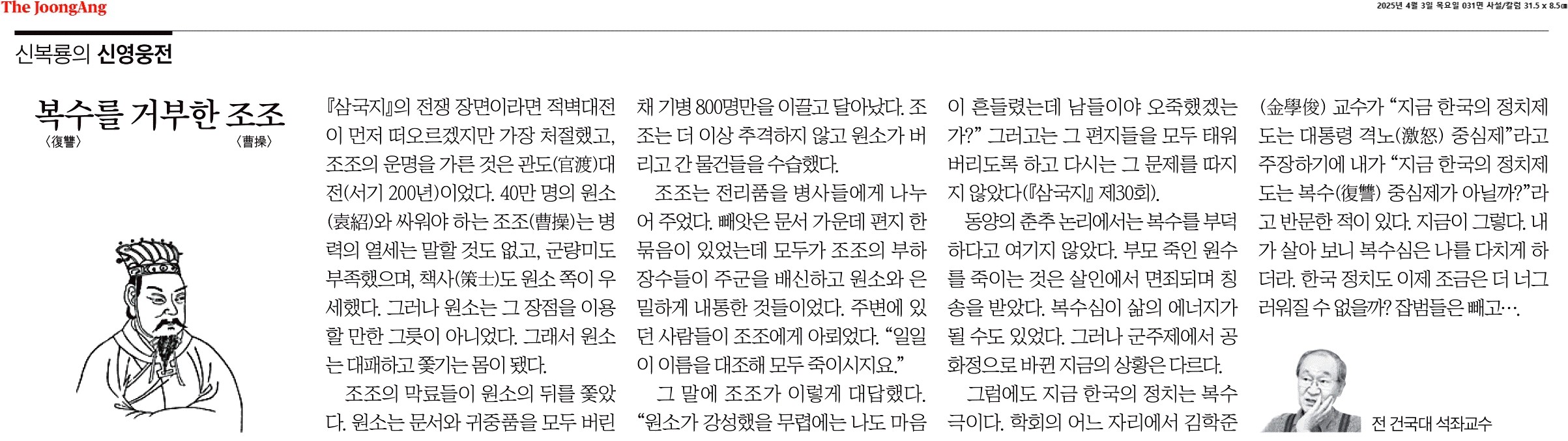 ⑤ 회의 어느 자리에서 김학준(金學俊) 교수가 “지금 한국의 정치제도는 대통령 격노(激怒) 중심제”라고 주장하기에 내가 “지금 한국의 정치제도는 복수(復讐) 중심제가 아닐까?”라고 반문한 적이 있다. 지금이 그렇다. 내가 살아 보니 복수심은 나를 다치게 하더라.