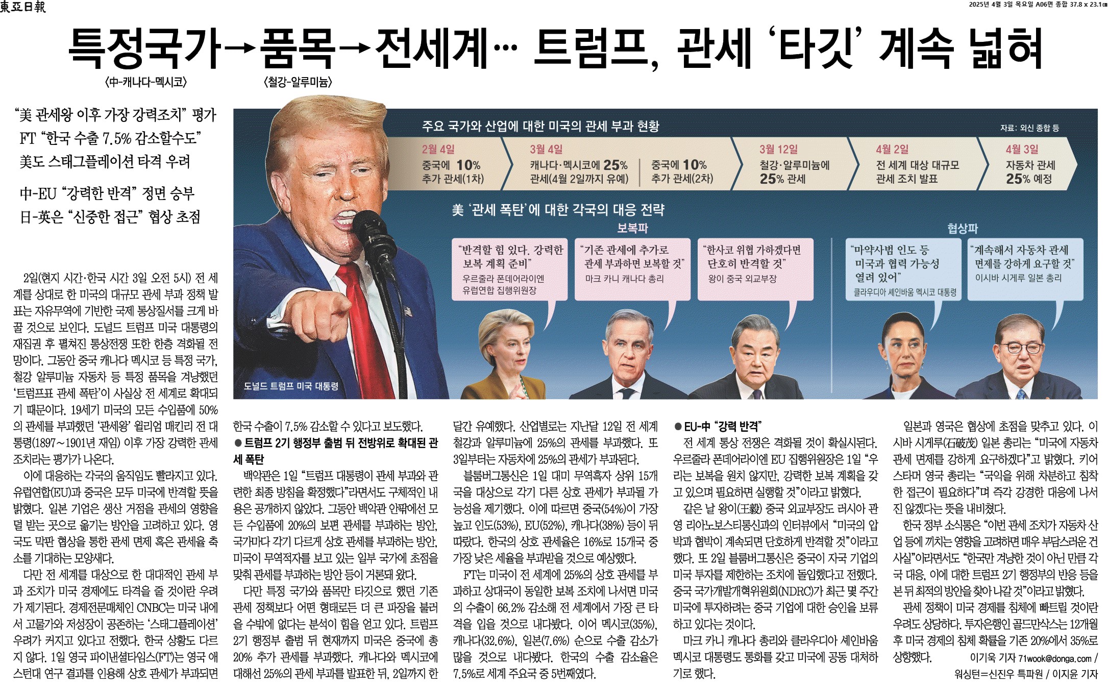 ⑤ 한국 정부 소식통은 “이번 관세 조치가 자동차 산업 등에 끼치는 영향을 고려하면 매우 부담스러운 건 사실”이라면서도 “한국만 겨냥한 것이 아닌 만큼 각국 대응, 이에 대한 트럼프 2기 행정부의 반응 등을 본 뒤 최적의 방안을 찾아 나갈 것”이라고 밝혔다.
