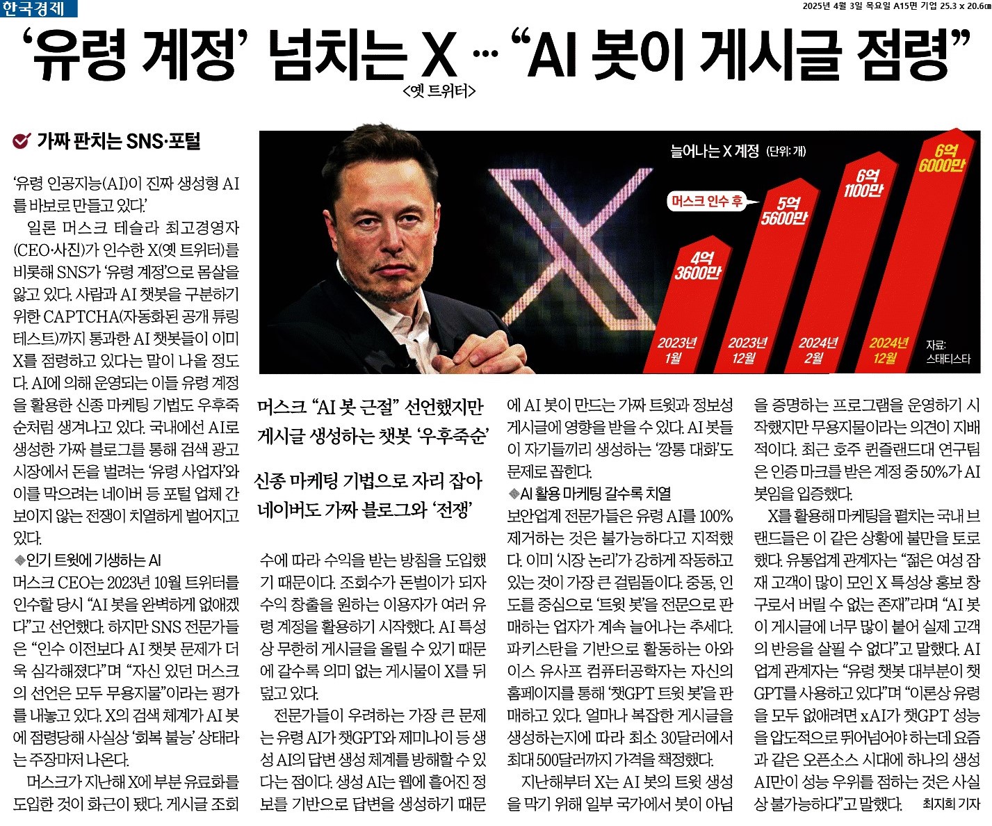 ② 머스크 CEO는 2023년 10월 트위터를 인수할 당시 “AI 봇을 완벽하게 없애겠다”고 선언했다. 하지만 SNS 전문가들은 “인수 이전보다 AI 챗봇 문제가 더욱 심각해졌다”며 “자신 있던 머스크의 선언은 모두 무용지물”이라는 평가를 내놓고 있다. X의 검색 체계가 AI 봇에 점령당해 사실상 ‘회복 불능’ 상태라는 주장마저 나온다.