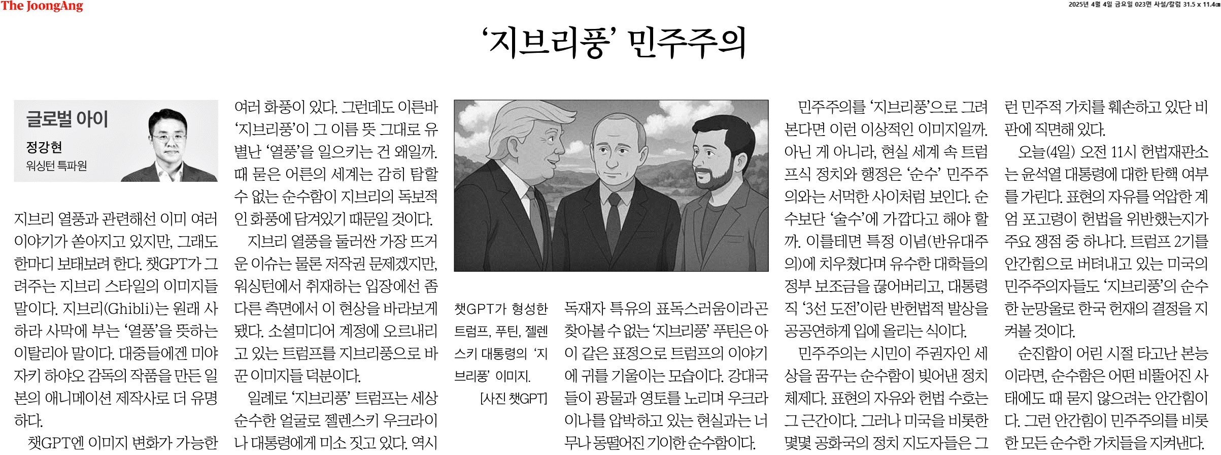 ③ 지브리 열풍을 둘러싼 가장 뜨거운 이슈는 물론 저작권 문제겠지만, 워싱턴에서 취재하는 입장에선 좀 다른 측면에서 이 현상을 바라보게 됐다. 소셜미디어 계정에 오르내리고 있는 트럼프를 지브리풍으로 바꾼 이미지들 덕분이다.