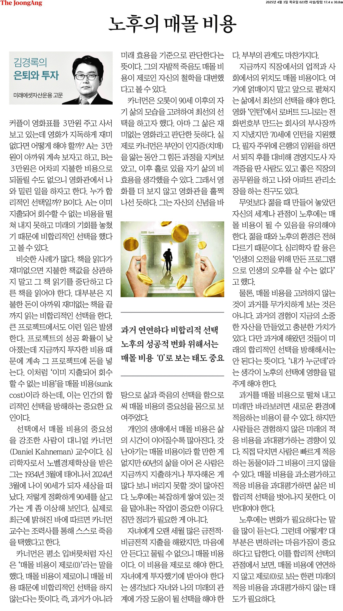 ③ 카너먼은 평소 입버릇처럼 자신은 ‘매몰 비용이 제로(0)’라는 말을 했다. 매몰 비용이 제로이니 매몰 비용 때문에 비합리적인 선택을 하지 않는다는 뜻이다. 즉, 과거가 아니라 미래 효용을 기준으로 판단한다는 뜻이다. 그의 자발적 죽음도 매몰 비용이 제로인 자신의 철학을 대변했다고 볼 수 있다.