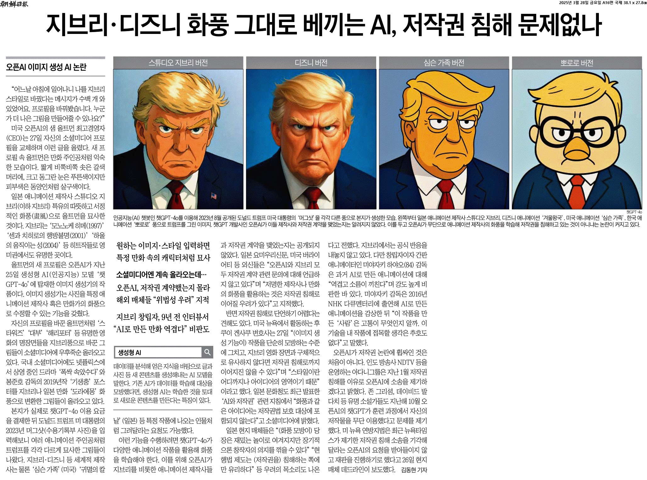 ③ 이런 기능을 수행하려면 챗GPT-4o가 다양한 애니메이션 작품을 활용해 화풍을 학습해야 한다. 이를 위해 오픈AI가 지브리를 비롯한 애니메이션 제작사들과 저작권 계약을 맺었는지는 공개되지 않았다. 일본 요미우리신문, 미국 버라이어티 등 외신들은 “오픈AI와 지브리 모두 저작권 계약 관련 문의에 대해 언급하지 않고 있다”며 “저명한 제작사나 만화의 화풍을 활용하는 것은 저작권 침해로 이어질 우려가 있다”고 지적했다.