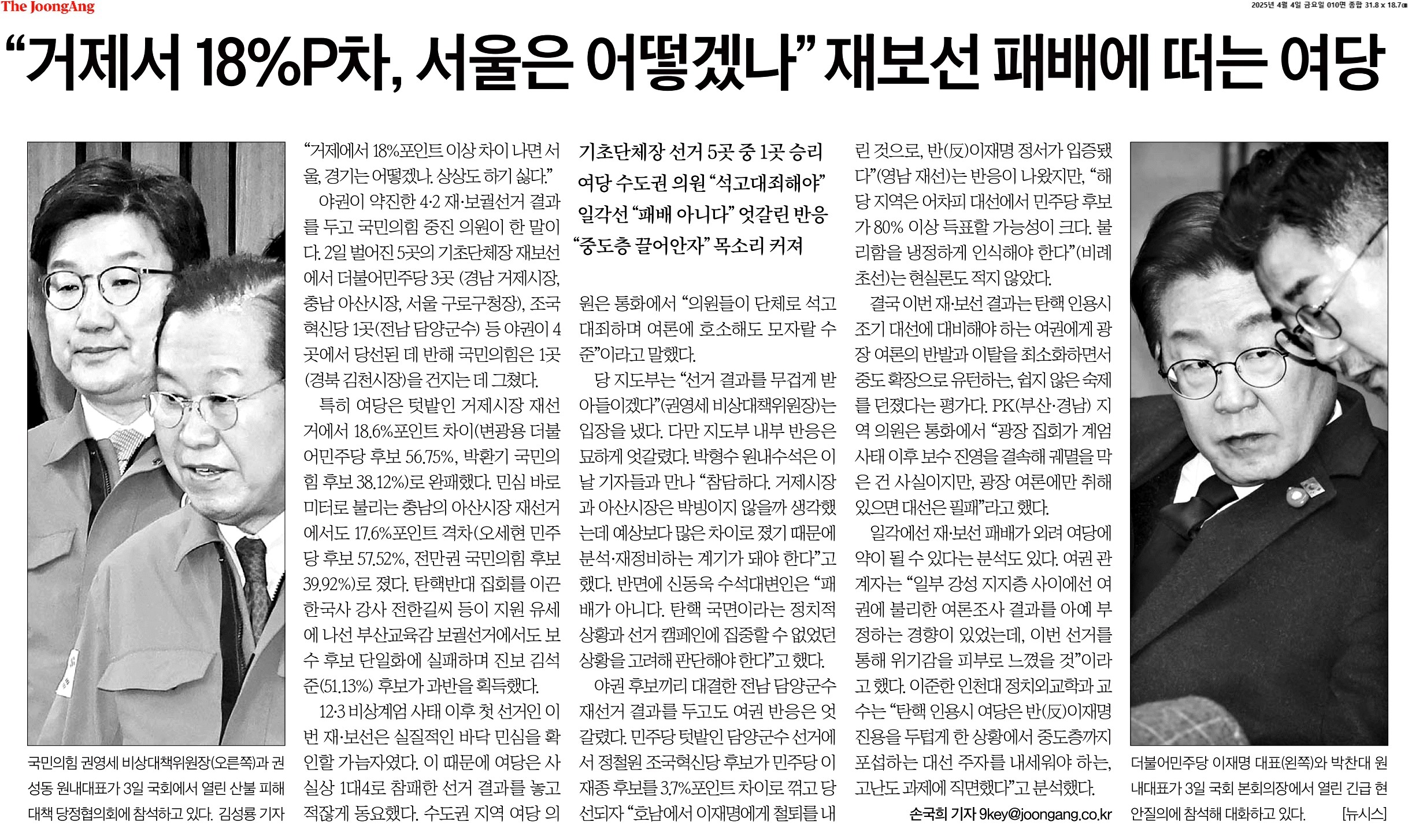 ③ 12·3 비상계엄 사태 이후 첫 선거인 이번 재·보선은 실질적인 바닥 민심을 확인할 가늠자였다. 이 때문에 여당은 사실상 1대4로 참패한 선거 결과를 놓고 적잖게 동요했다. 수도권 지역 여당 의원은 통화에서 “의원들이 단체로 석고대죄하며 여론에 호소해도 모자랄 수준”이라고 말했다.