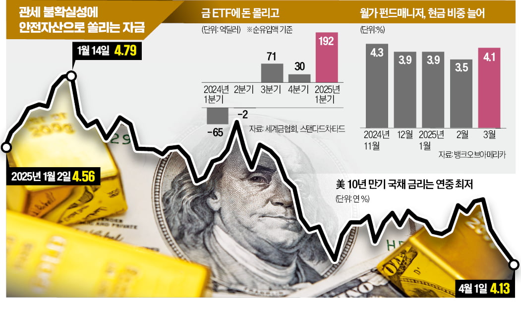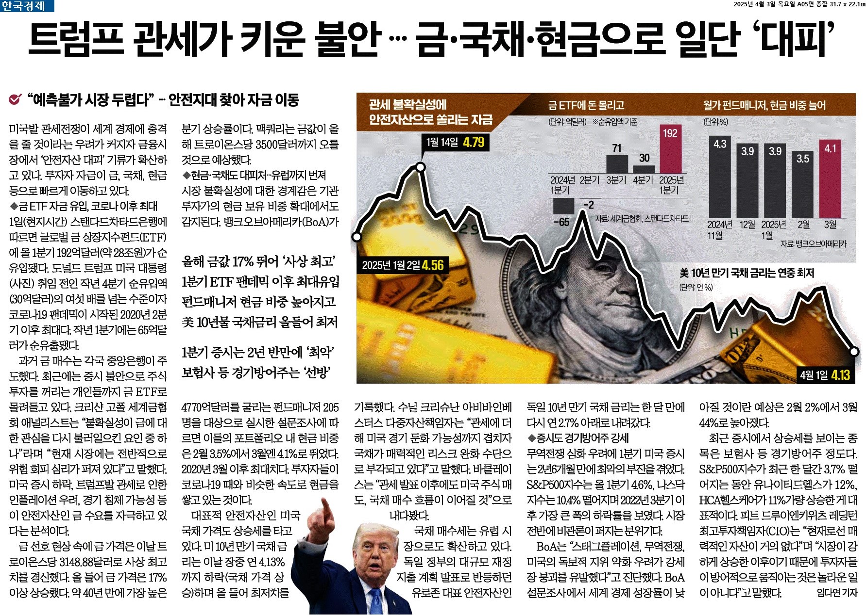 ① 미국발 관세전쟁이 세계 경제에 충격을 줄 것이라는 우려가 커지자 금융시장에서 ‘안전자산 대피’ 기류가 확산하고 있다. 투자자 자금이 금, 국채, 현금 등으로 빠르게 이동하고 있다.