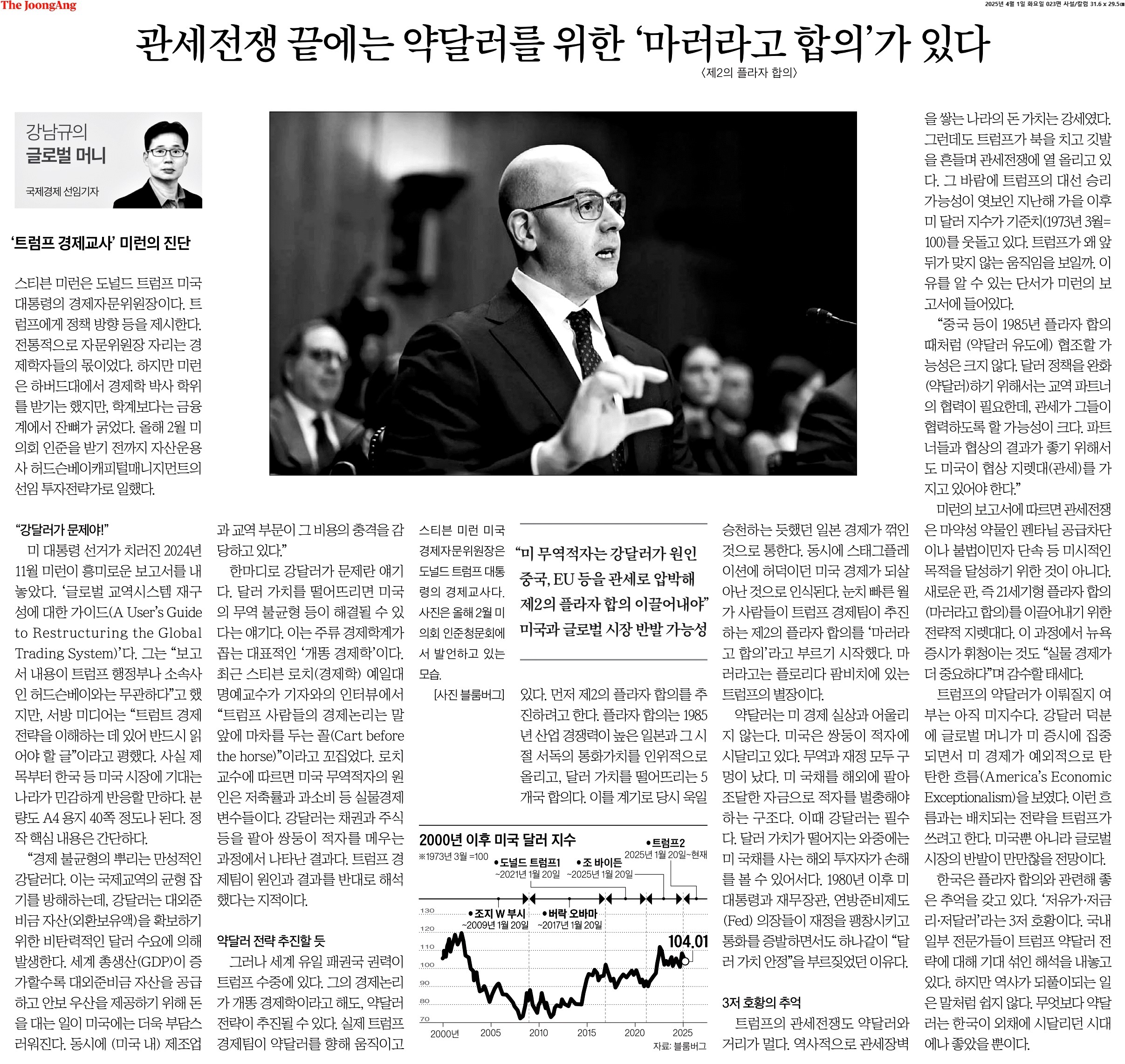 ⑤ 미런의 보고서에 따르면 관세전쟁은 마약성 약물인 펜타닐 공급차단이나 불법이민자 단속 등 미시적인 목적을 달성하기 위한 것이 아니다. 새로운 판, 즉 21세기형 플라자 합의(마러라고 합의)를 이끌어내기 위한 전략적 지렛대다. 이 과정에서 뉴욕 증시가 휘청이는 것도 “실물 경제가 더 중요하다”며 감수할 태세다.
