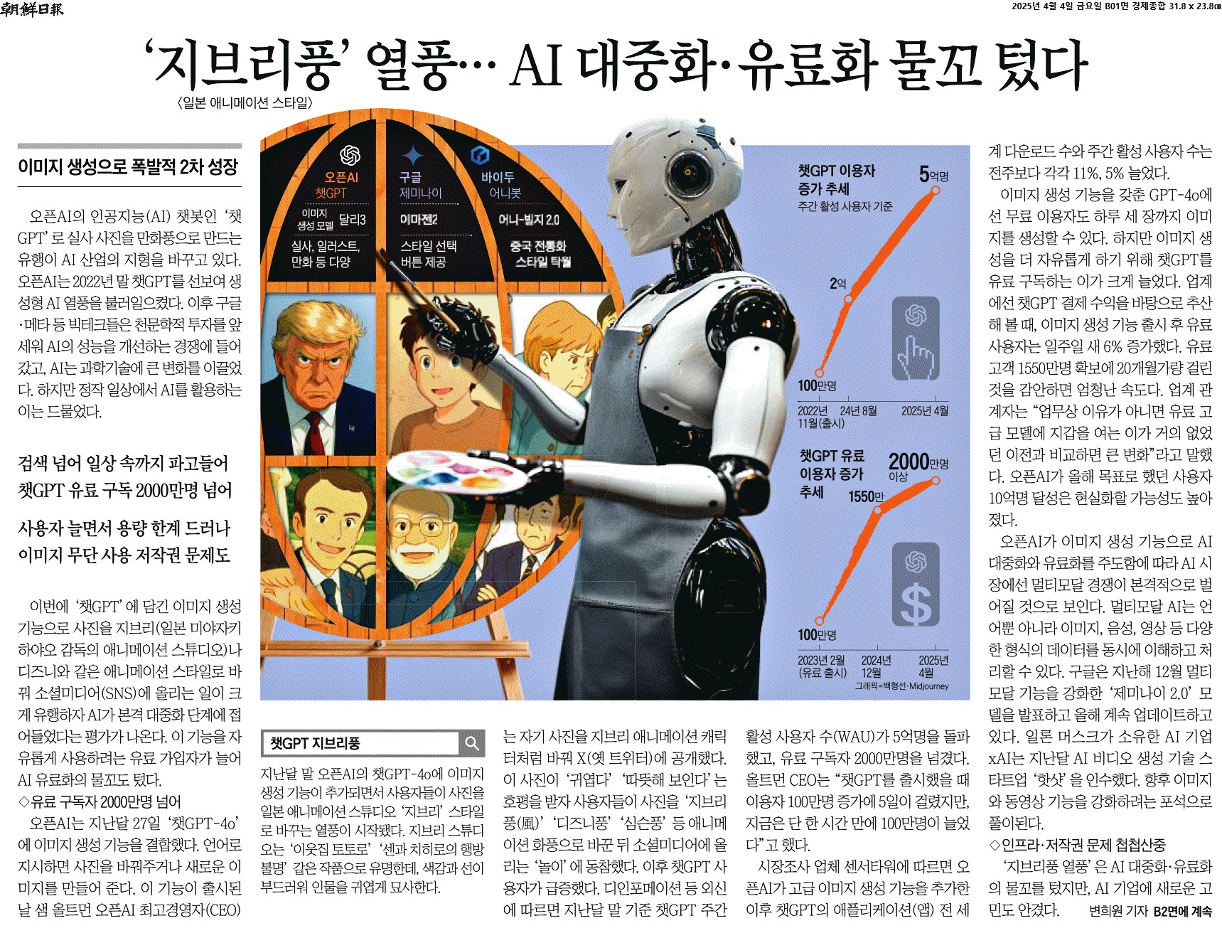 ② 이번에 ‘챗GPT’에 담긴 이미지 생성 기능으로 사진을 지브리(일본 미야자키 하야오 감독의 애니메이션 스튜디오)나 디즈니와 같은 애니메이션 스타일로 바꿔 소셜미디어(SNS)에 올리는 일이 크게 유행하자 AI가 본격 대중화 단계에 접어들었다는 평가가 나온다. 이 기능을 자유롭게 사용하려는 유료 가입자가 늘어 AI 유료화의 물꼬도 텄다.