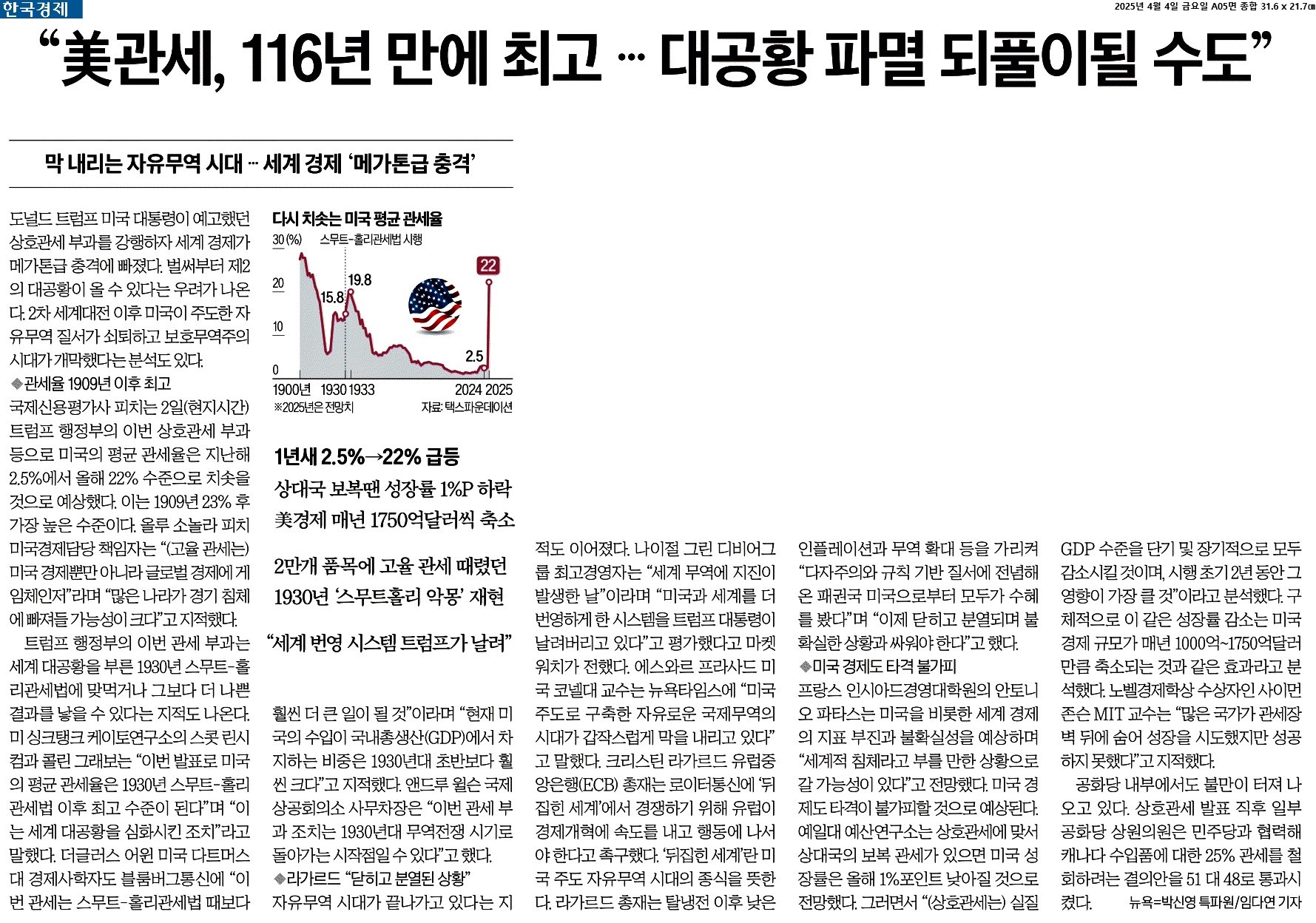 ③ “이번 발표로 미국의 평균 관세율은 1930년 스무트-홀리관세법 이후 최고 수준이 된다”며 “이는 세계 대공황을 심화시킨 조치”라고 말했다. 더글러스 어윈 미국 다트머스대 경제사학자도 블룸버그통신에 “이번 관세는 스무트-홀리관세법 때보다 훨씬 더 큰 일이 될 것”이라며 “현재 미국의 수입이 국내총생산(GDP)에서 차지하는 비중은 1930년대 초반보다 훨씬 크다”
