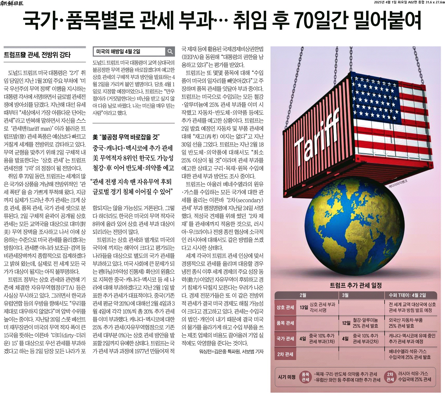 ① 도널드 트럼프 미국 대통령은 ‘2기’ 취임 당일인 지난 1월 20일 주요 부처에 ‘미국 우선주의 무역 정책’ 이행을 지시하는 대통령 각서에 서명하면서 글로벌 관세전쟁에 방아쇠를 당겼다. 지난해 대선 유세 때부터 “세상에서 가장 아름다운 단어는 관세”라고 반복해 말하면서 자신을 스스로 ‘관세맨(tariff man)‘이라 불러온 트럼프발(發) 관세 폭풍은 예상보다 빠르고 거칠게 세계를 전방위로 강타하고 있다. 무역 균형을 맞추기 위해 2일 구체적 내용을 발표한다는 ‘상호 관세‘는 트럼프 관세전쟁 ‘1막‘의 정점이 될 전망이다.
