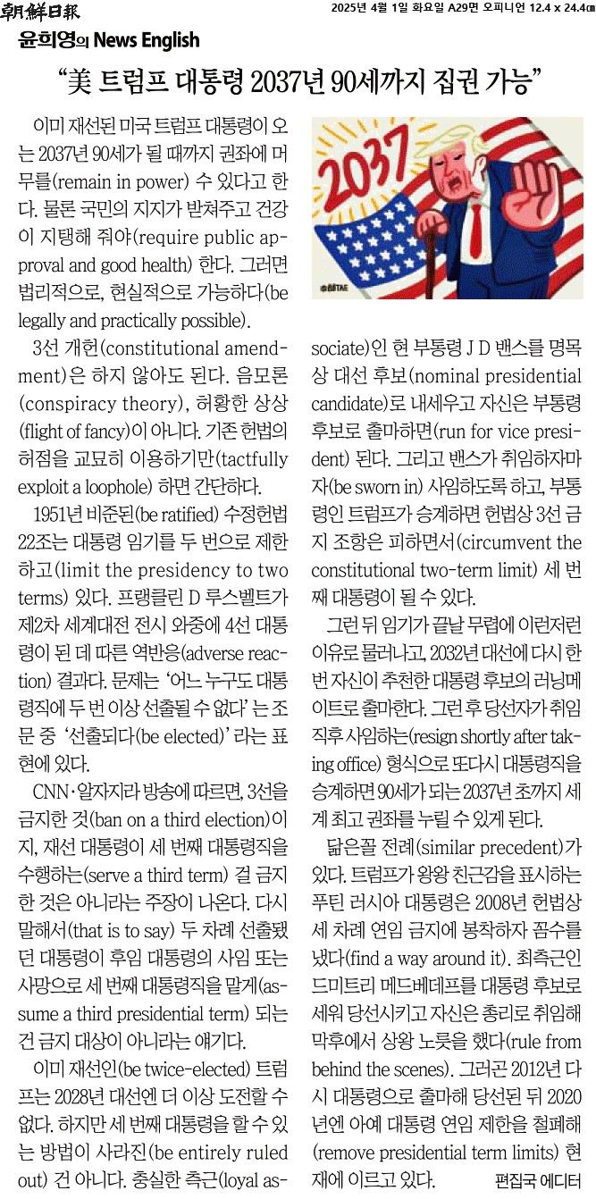 ① 이미 재선된 미국 트럼프 대통령이 오는 2037년 90세가 될 때까지 권좌에 머무를(remain in power) 수 있다고 한다. 물론 국민의 지지가 받쳐주고 건강이 지탱해 줘야(require public approval and good health) 한다. 그러면 법리적으로, 현실적으로 가능하다(be legally and practically possible).