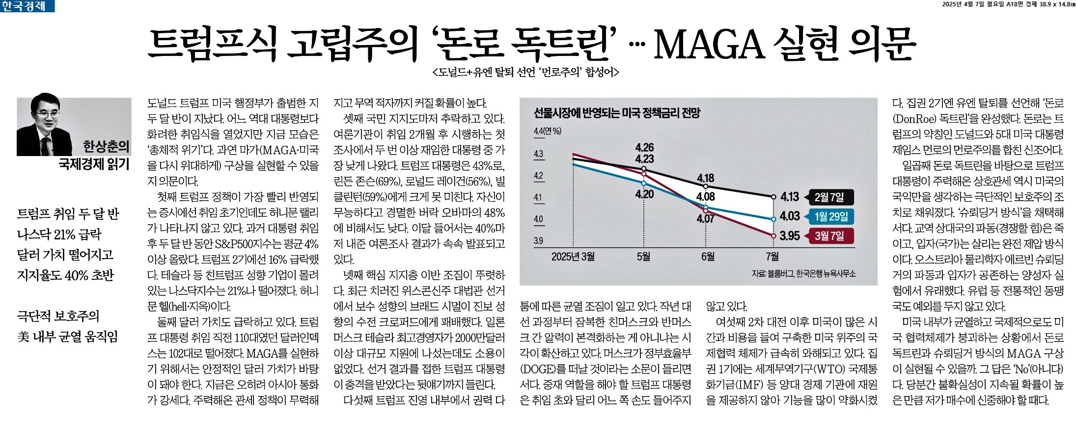 ① 도널드 트럼프 미국 행정부가 출범한 지 두 달 반이 지났다. 어느 역대 대통령보다 화려한 취임식을 열었지만 지금 모습은 ‘총체적 위기’다. 과연 마가(MAGA·미국을 다시 위대하게) 구상을 실현할 수 있을지 의문이다.