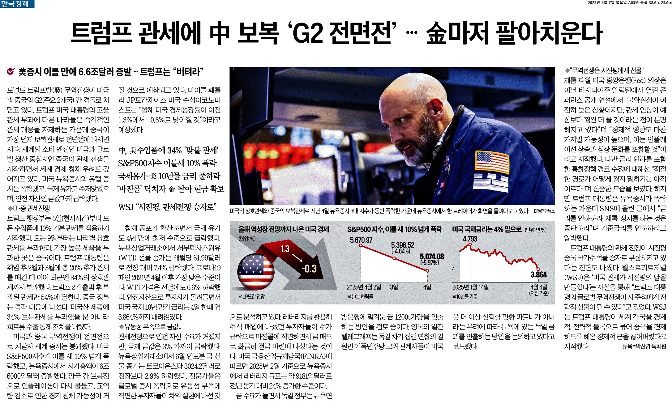 ② 트럼프 관세 여파로 세계 경제가 침체에 빠지고 인플레이션이 재발할 것이라는 우려가 커지고 있다. 미국 최대 은행 JP모간체이스는 트럼프 행정부의 관세로 올해 미국 경제가 역성장할 것으로 전망했다.