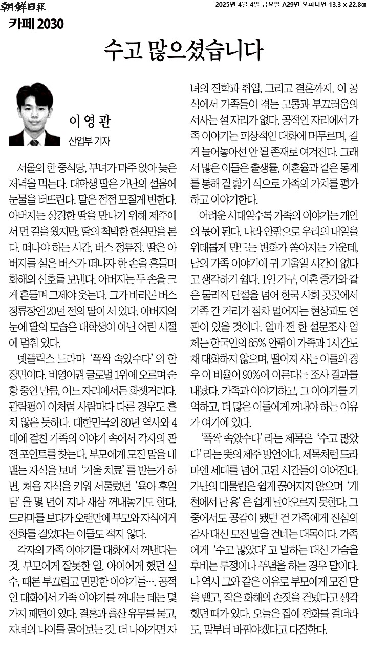 ⑤ ‘폭싹 속았수다’라는 제목은 ‘수고 많았다’라는 뜻의 제주 방언이다. 제목처럼 드라마엔 세대를 넘어 고된 시간들이 이어진다. 가난의 대물림은 쉽게 끊어지지 않으며 ‘개천에서 난 용’은 쉽게 날아오르지 못한다. 그중에서도 공감이 됐던 건 가족에게 진심의 감사 대신 모진 말을 건네는 대목이다.