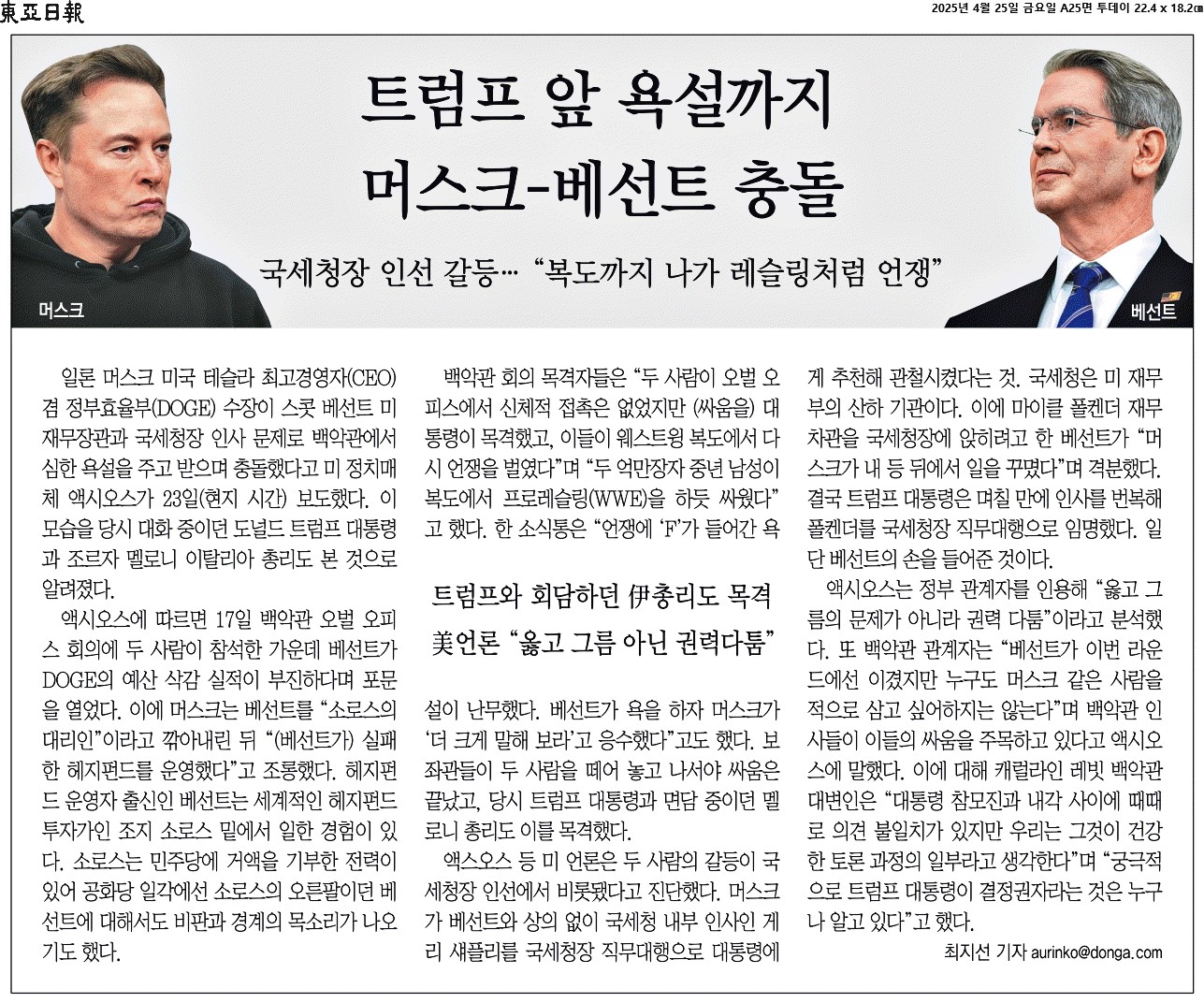 ④ 액스오스 등 미 언론은 두 사람의 갈등이 국세청장 인선에서 비롯됐다고 진단했다. 머스크가 베선트와 상의 없이 국세청 내부 인사인 게리 섀플리를 국세청장 직무대행으로 대통령에게 추천해 관철시켰다는 것. 국세청은 미 재무부의 산하 기관이다.