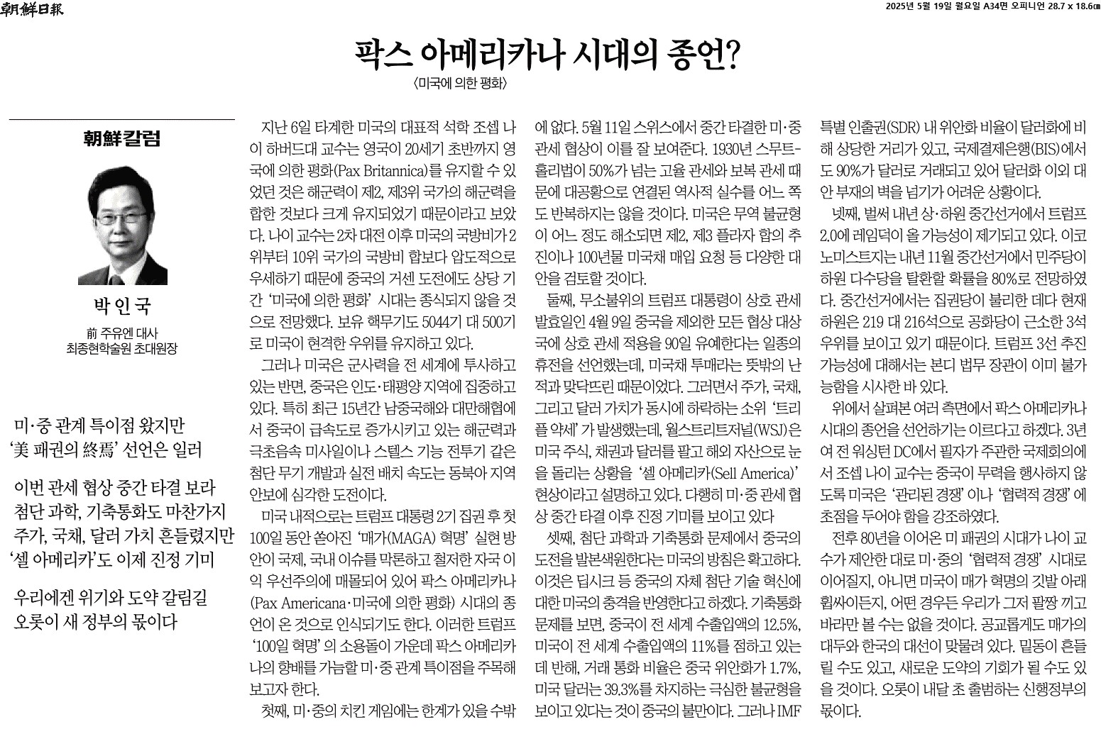 ① 지난 6일 타계한 미국의 대표적 석학 조셉 나이 하버드대 교수는 그의 저서 ‘Is the American Century Over’에서 영국이 20세기 초반까지 영국에 의한 평화(Pax Britannica)를 유지할 수 있었던 것은 해군력이 제2, 제3위 국가의 해군력을 합한 것보다 크게 유지되었기 때문이라고 보았다. 나이 교수는 2차 대전 이후 미국의 국방비가 2위부터 10위국가의 국방비 합보다 압도적으로 우세하기 때문에 중국의 거센 도전에도 상당 기간 ‘미국에 의한 평화’ 시대는 종식되지 않을 것으로 전망했다.
