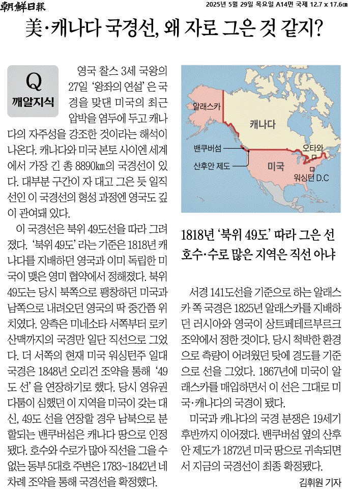 ① 영국 찰스 3세 국왕의 27일 ‘왕좌의 연설’은 국경을 맞댄 미국의 최근 압박을 염두에 두고 캐나다의 자주성을 강조한 것이라는 해석이 나온다. 캐나다와 미국 사이엔 세계에서 가장 긴 총 8890㎞의 국경선이 있다. 대부분 구간이 자 대고 그은 듯 일직선인 이 국경선의 형성 과정엔 영국도 깊이 관여돼 있다.