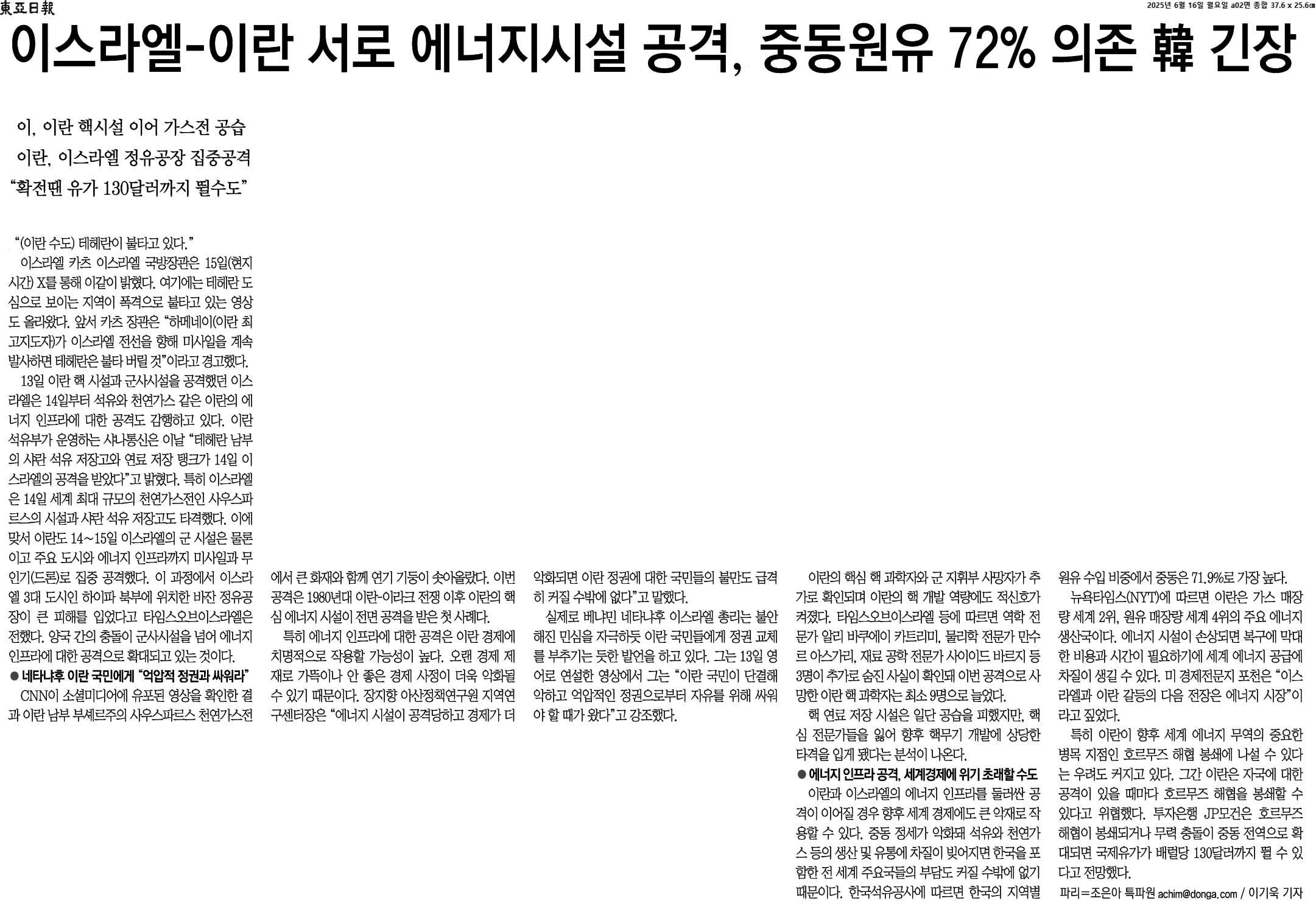 ② 13일 이란 핵 시설과 군사시설을 공격했던 이스라엘은 14일부터 석유와 천연가스 같은 이란의 에너지 인프라에 대한 공격도 감행하고 있다.