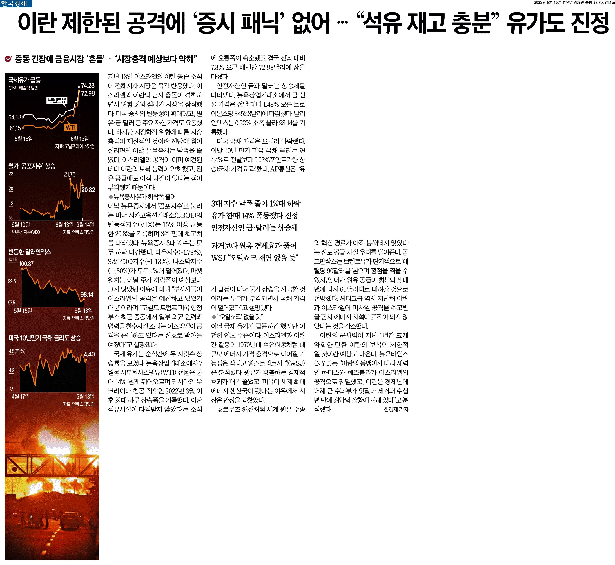 ① 지난 13일 이스라엘의 이란 공습 소식이 전해지자 시장은 즉각 반응했다. 이스라엘과 이란의 군사 충돌이 격화하면서 위험 회피 심리가 시장을 잠식했다. 미국 증시의 변동성이 확대됐고, 원유·금·달러 등 주요 자산 가격도 요동쳤다. 하지만 지정학적 위험에 따른 시장 충격이 제한적일 것이란 전망에 힘이 실리면서 이날 뉴욕증시는 낙폭을 줄였다. 이스라엘의 공격이 이미 예견된 데다 이란의 보복 능력이 약화했고, 원유 공급에도 아직 차질이 없다는 점이 부각됐기 때문이다.