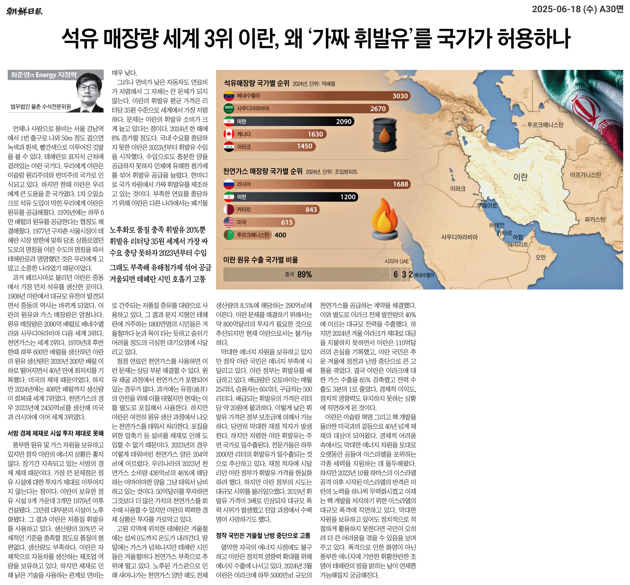 ② 원유 매장량은 2090억 배럴로 베네수엘라와 사우디아라비아 다음 세계 3위다. 천연가스는 세계 2위다. 1970년대 후반 한때 하루 600만 배럴을 생산하던 이란의 원유 생산량은 2020년 200만 배럴 이하로 떨어지면서 40년 만에 최저치를 기록했다. 미국의 제재 때문이었다.