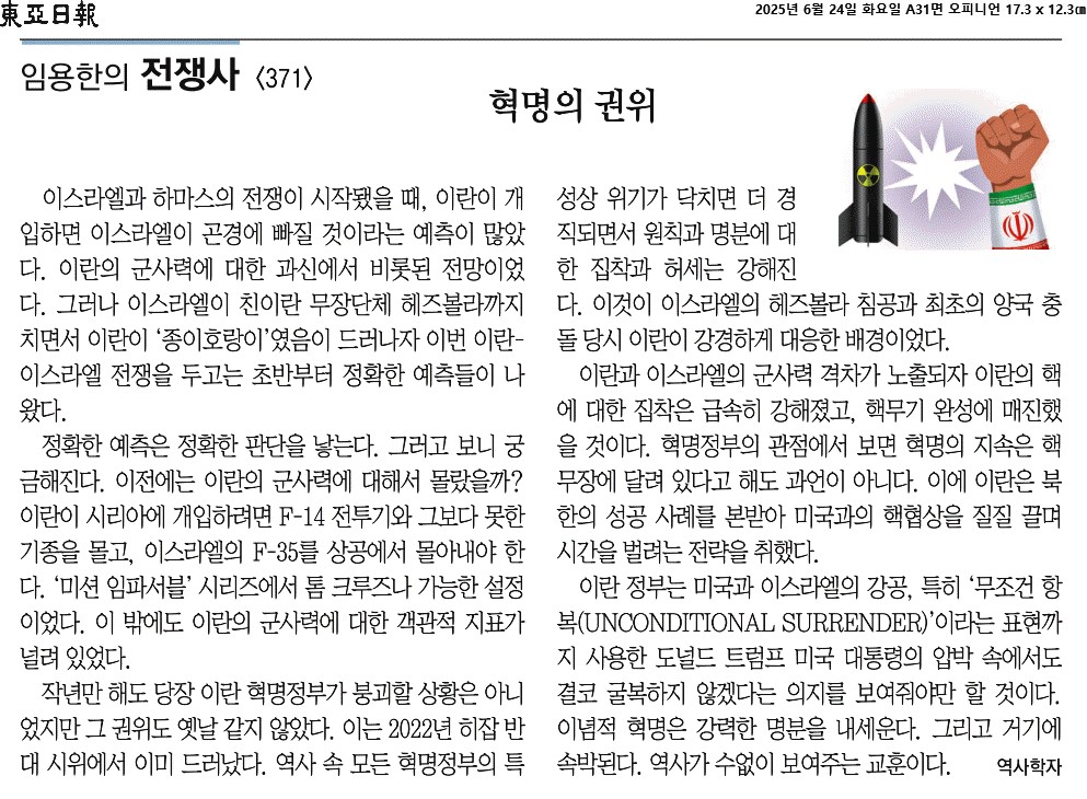 ⑤ 이란 정부는 미국과 이스라엘의 강공, 특히 ‘무조건 항복(UNCONDITIONAL SURRENDER)’이라는 표현까지 사용한 도널드 트럼프 미국 대통령의 압박 속에서도 결코 굴복하지 않겠다는 의지를 보여줘야만 할 것이다. 이념적 혁명은 강력한 명분을 내세운다. 그리고 거기에 속박된다. 역사가 수없이 보여주는 교훈이다.