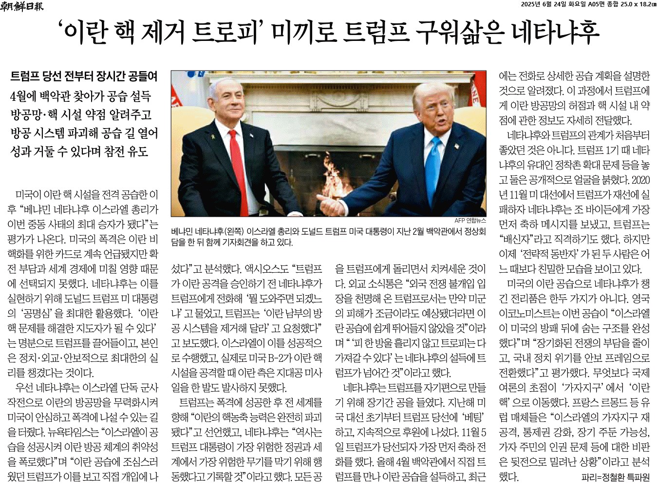 ③ 모든 공을 트럼프에게 돌리면서 치켜세운 것이다. 외교 소식통은 “외국 전쟁 불개입 입장을 여러 차례 천명해 온 트럼프로서는 만약 미군의 피해가 조금이라도 예상됐더라면 이란 공습에 쉽게 뛰어들지 않았을 것”이라며 “‘피 한 방울 흘리지 않고 트로피는 다 가져갈 수 있다’는 네타냐후의 설득에 트럼프가 넘어간 것”이라고 했다.
