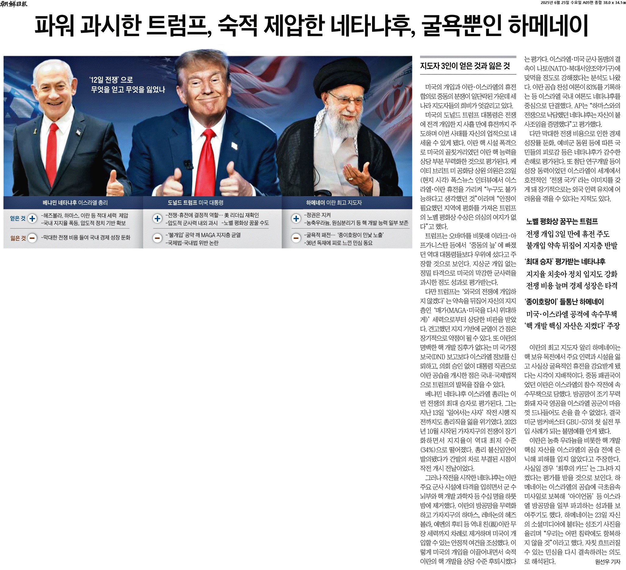 ① 미국의 도널드 트럼프 대통령은 전쟁에 전격 개입한 지 사흘 만에 휴전까지 주도하며 이번 사태를 자신의 업적으로 내세울 수 있게 됐다. 이란 핵 시설 폭격으로 미국의 골칫거리였던 이란 핵 능력을 상당 부분 무력화한 것으로 평가된다.