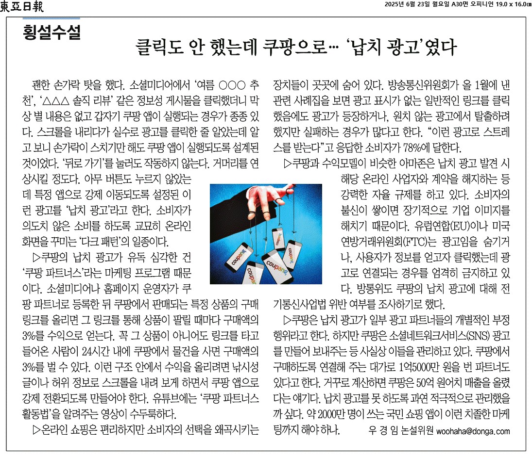 ① 괜한 손가락 탓을 했다. 소셜미디어에서 ‘여름 OOO 추천’, ‘△△△ 솔직 리뷰’ 같은 정보성 게시물을 클릭했더니 막상 별 내용은 없고 갑자기 쿠팡 앱이 실행되는 경우가 종종 있다. 스크롤을 내리다가 실수로 광고를 클릭한 줄 알았는데 알고 보니 손가락이 스치기만 해도 쿠팡 앱이 실행되도록 설계된 것이었다. ‘뒤로 가기’를 눌러도 작동하지 않는다.