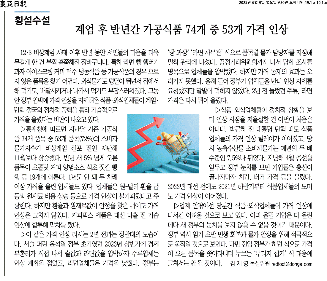 ① 12·3 비상계엄 사태 이후 반년 동안 서민들의 마음을 더욱 무겁게 한 건 부쩍 홀쭉해진 장바구니다. 특히 라면 빵 햄버거 과자 아이스크림 커피 맥주 냉동식품 등 가공식품의 경우 오르지 않은 품목을 찾기 어렵다. 외식물가도 덩달아 뛰면서 집에서 해 먹기도, 배달시키거나 나가서 먹기도 부담스러워졌다. 그동안 정부 압박에 가격 인상을 자제해온 식품·외식업체들이 계엄·탄핵 정국의 정치적 공백을 틈타 기습적으로 가격을 올렸다는 비판이 나오고 있다.