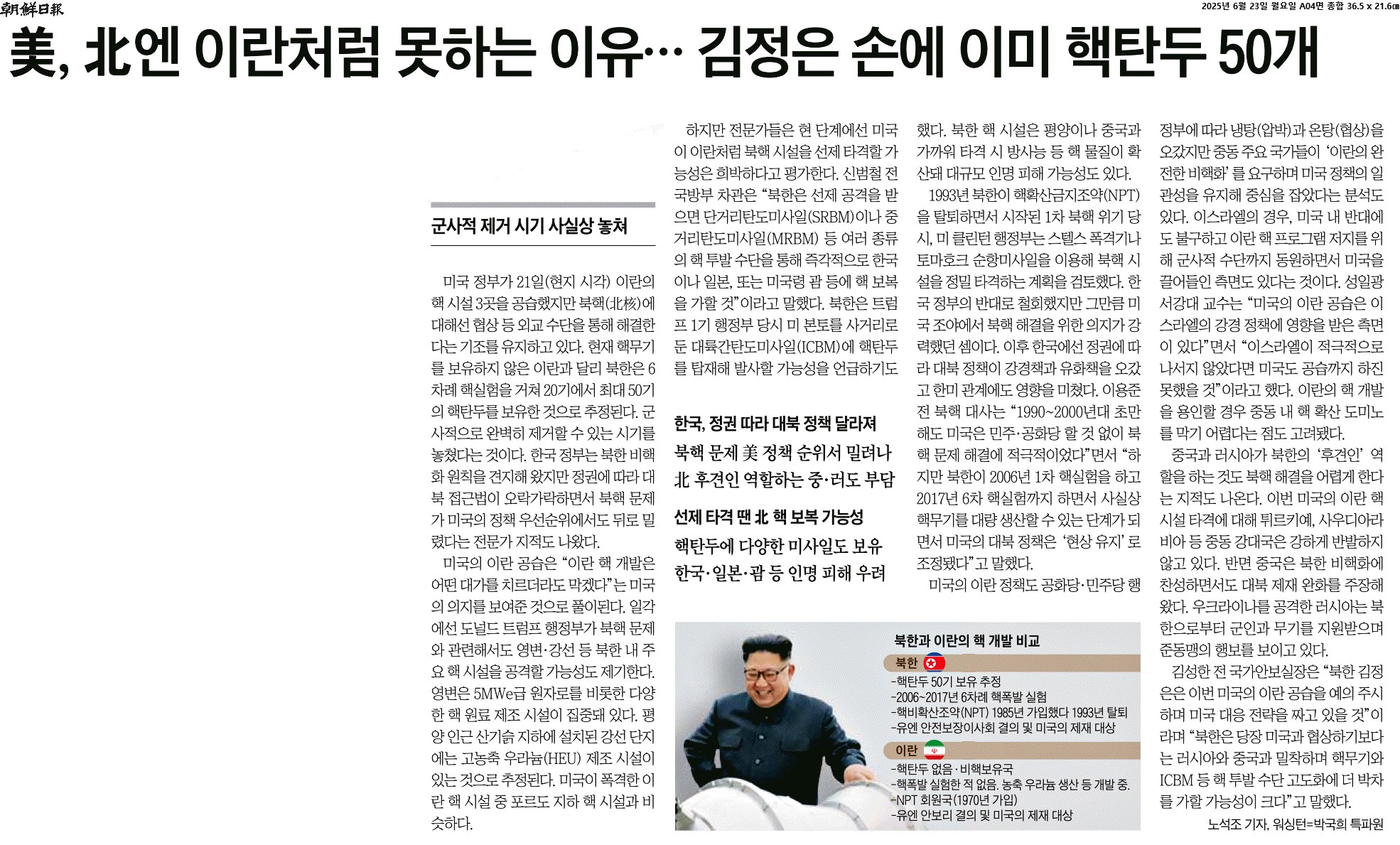 ⑤ 김성한 전 국가안보실장은 “북한 김정은은 이번 미국의 이란 공습을 예의 주시하며 미국 대응 전략을 짜고 있을 것”이라며 “북한은 당장 미국과 협상하기보다는 러시아와 중국과 밀착하며 핵무기와 ICBM 등 핵 투발 수단 고도화에 더 박차를 가할 가능성이 크다”고 말했다.